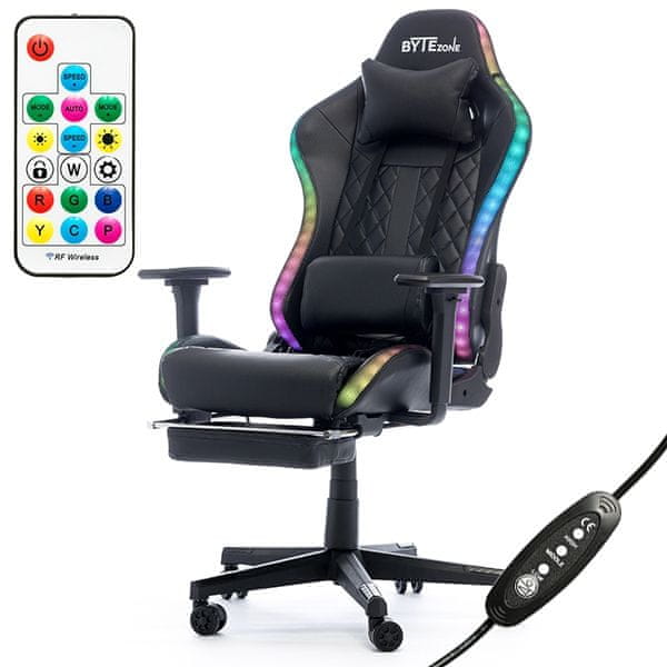 - Podesiva RGB rasvjeta na rubovima stolice (crvena, zelena, plava, žuta, tirkizna, ljubičasta, bijela i mnoge uobičajene kombinacije boja)