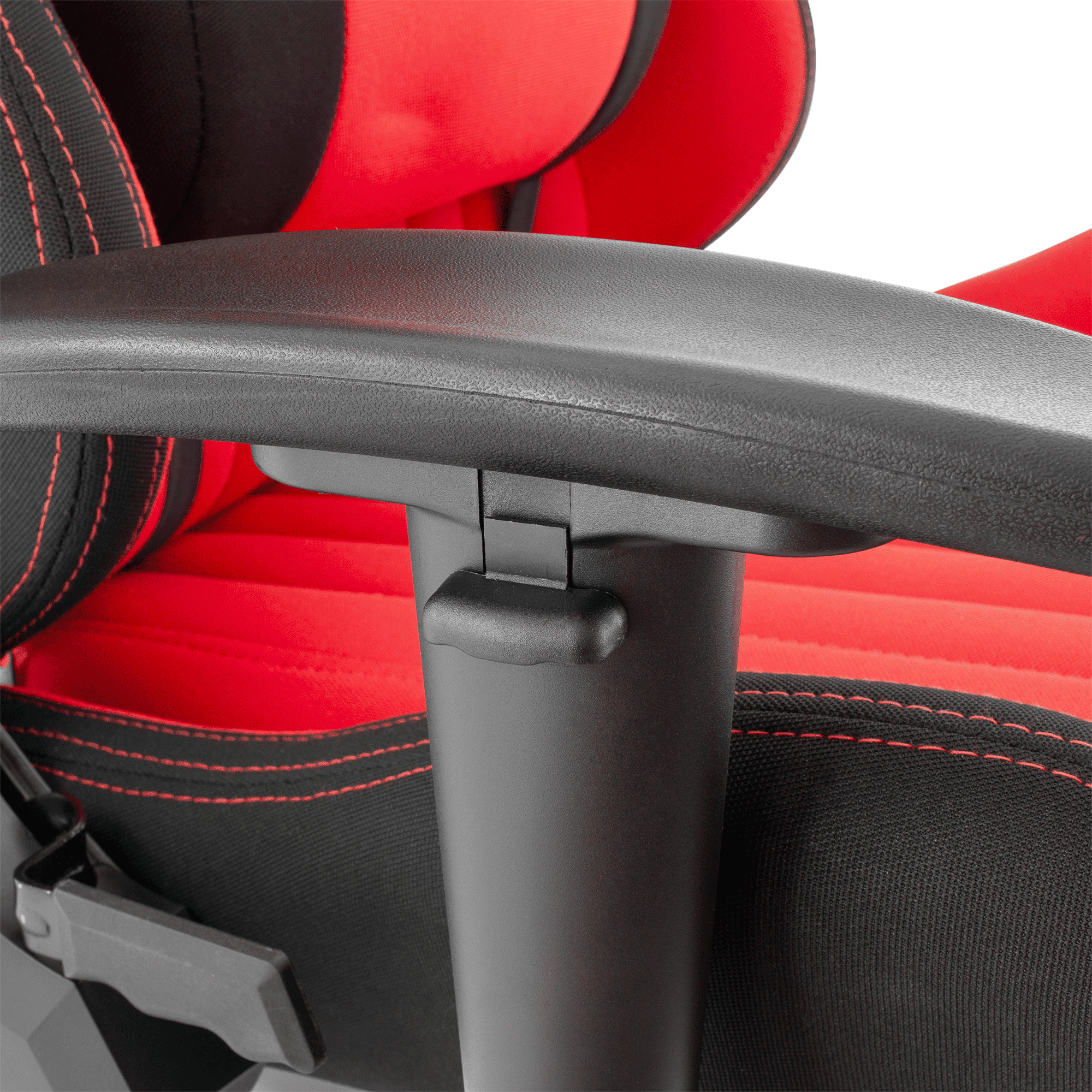 Gaming stolica RED DEVIL, crveno-crna, 2D nasloni za ruke, podesivi nagib do 160°, jastuk za glavu i leđa, visina sjedala 46–56 cm, nosivost 120 kg, metalni okvir, PVC + tkanina.