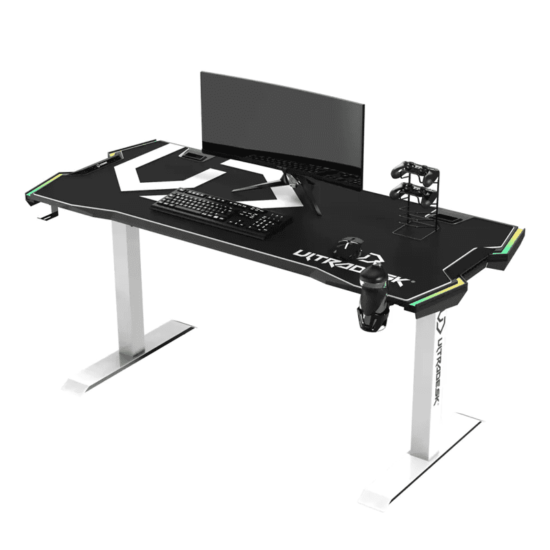 Ultradesk Gaming stol FORCE SNOW - bijeli, 166x70 cm, 66-86 cm, 5 razina visine, s XXL podlogom za miš, RGB rasvjetom, držačem za čaše i slušalicama