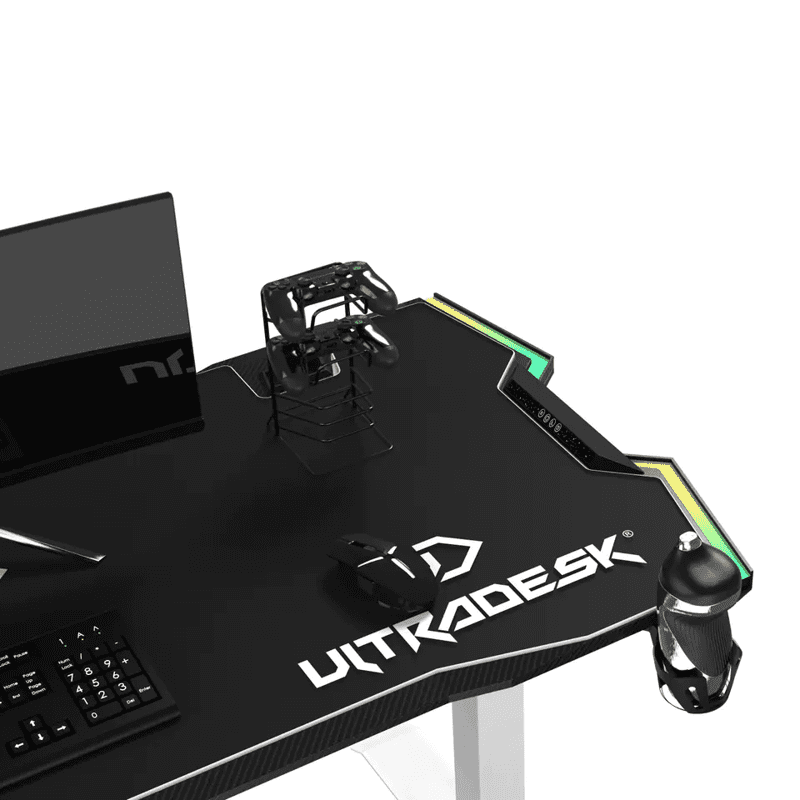 Ultradesk Gaming stol FORCE SNOW - bijeli, 166x70 cm, 66-86 cm, 5 razina visine, s XXL podlogom za miš, RGB rasvjetom, držačem za čaše i slušalicama