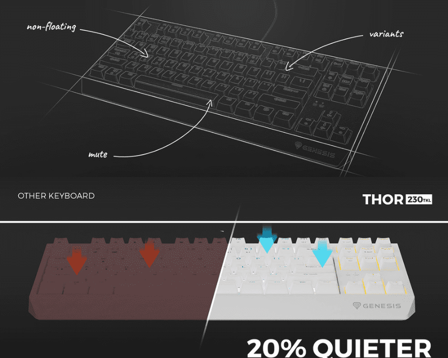Buka tipkovnice problem je s kojim se suočavaju mnogi igrači. Znamo koliko to može biti važno ne samo za vas, već i za članove vašeg kućanstva. Zato smo Genesis Thor 230 TKL opremili dodatnom pjenom postavljenom između tiskane ploče i ploče tipkovnice . To apsorbira vibracije uzrokovane jakim pritiscima tipki, smanjujući buku tipkovnice za 20%, i to nije sve. Razmaknica je također dobila dodatno utišavanje. Naš sustav za poništavanje buke osigurava tihu igru čak i tijekom intenzivnih igara.