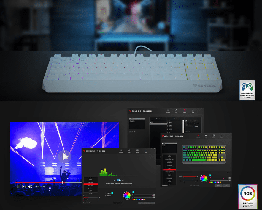 Doživite potpuno prilagodljivo Prismo Effect™ osvjetljenje sa 16 milijuna boja i 25 načina rada. Val? Kontinuirano pozadinsko osvjetljenje? Pojedinačno pozadinsko osvjetljenje svake tipke? Što kažete na način rada ekvilajzera koji će osvijetliti vašu radnu stanicu u ritmu vaše omiljene pjesme? S Genesis Thor 230 TKL i namjenskim softverom, to je jednostavno. Štoviše, lako čitljiva aplikacija omogućit će vam stvaranje makro kombinacija i njihovo dodjeljivanje bilo kojoj tipki.