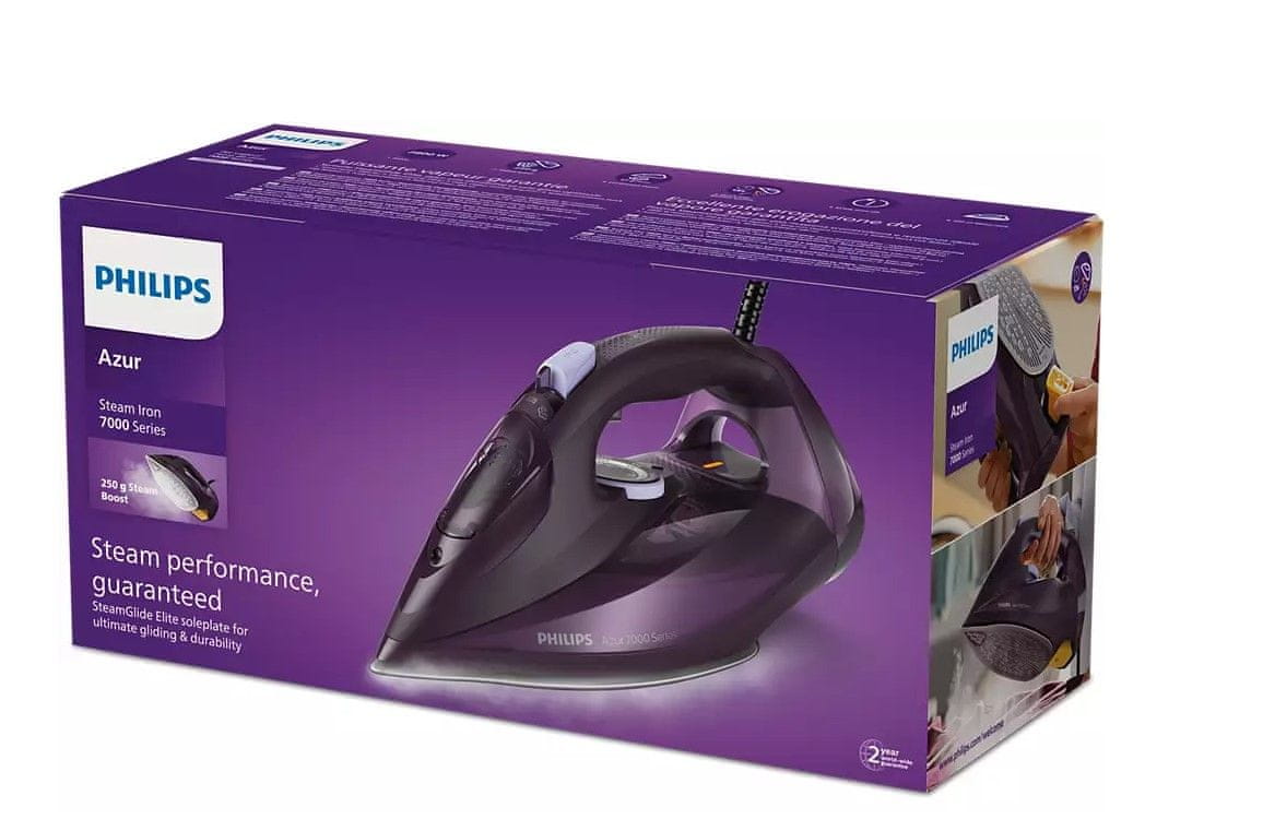 Glačalo serije 7000 opremljeno je potplatom SteamGlide Elite koja je otporna na ogrebotine. Može se pohvaliti snažnim performansama, ujednačenim ispuštanjem pare i brzim sustavom uklanjanja vapnenca. Glačalo se automatski isključuje nakon 30 sekundi u vodoravnom položaju i nakon osam minuta u uspravnom položaju.