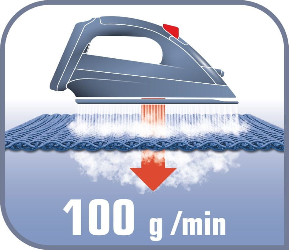 Otpuštanje pare do 100 g/min lako uklanja nabore. Za osvježavanje rublja upotrijebite okomitu paru.