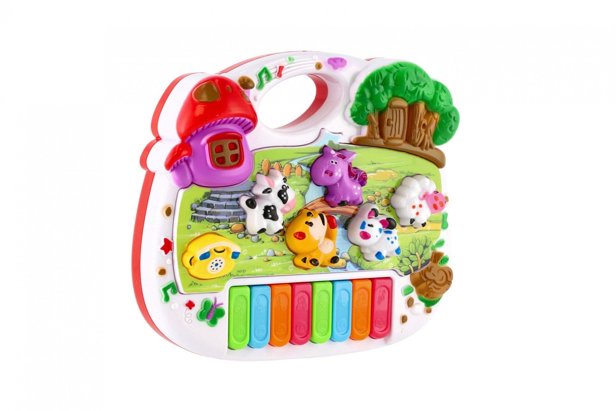 Klavir za djecu iz kolekcije Teddies s glasovima i frazama na engleskom. Djeca mogu svirati melodije i naučiti imenovati životinje i njihove glasove. Pogodno za djecu od 3 godine nadalje. Napajanje pomoću baterija 3×AA, koje nisu uključene. Cijeli opis