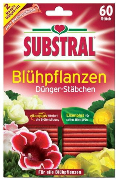 Substral gnojni štapići za lončanice i balkonsko bilje (crveni) brine za zdravo lišće. Ima visok postotak željeza, što sprječava sušenje lišća. Štapići djeluju duže od dva mjeseca, samo gurnite štap u zemlju do prvog članka, i osigurajte zdrave i bujne biljke. Korištenje je sigurno i lako. Uporaba: Uporaba je jednostavna, štapić potisnite u zemlju. Količina štapića je ovisna o veličini lonca. Koristimo od ½ do 5 štapića. Vrijeme korištenja: cijela godina (siječanj – prosinac) Sastav: gnojilo NPK, koje sadrži dušik s dugotrajnim djelovanjem, 10,5–10,8–10,2, s mikro hranjivim tvarima, niski sadržaja klora |