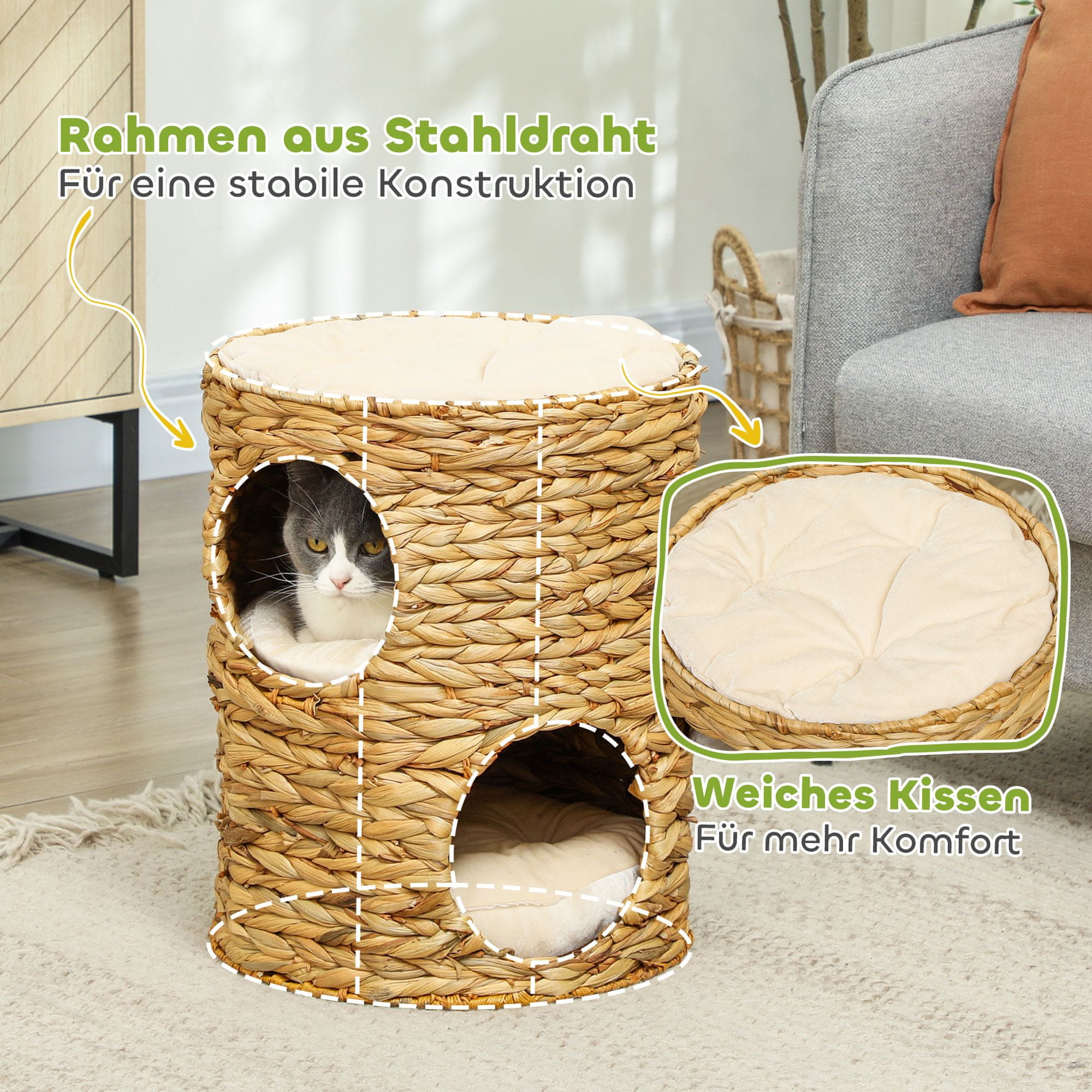 Ovaj udobni bačvasti grebalica za mačke nudi vašim mačjim prijateljima savršeno mjesto za odmor igru i promatranje okoline. S dva udobna skrovišta i mekanom jastučićem na vrhu platforme pruža i zabavu i sigurno utočište za mačke. Prirodni dizajn od vodene hijacinte skladno se uklapa u svaki kućni dekor čineći ga atraktivnim i funkcionalnim dodatkom vašem životnom prostoru. Boja: Svijetlo smeđa Materijal: Čelik vodena hijacinta baršunasti materijal (100% poliester) Ukupne dimenzije: Ø40 × 50V cm Unutarnja visina: 22 cm (svaka razina) Veličina otvora: Ø18 cm Dimenzije jastučića: Ø38 × 6V cm Pogodno za mačke do 35 kg Nije potrebna montaža