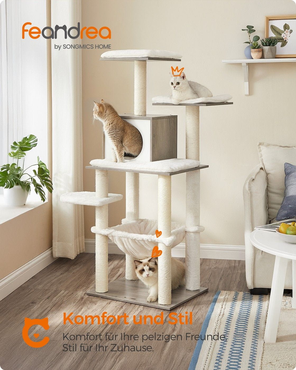 Ovaj moderni mačji toranj dizajniran je kako bi vašoj mački pružio udoban i zanimljiv prostor za penjanje grebanje i odmor. Sa stilskim izgledom koji se besprijekorno uklapa u suvremene interijere nudi više platformi udobnu špilju i mekani ležaljku za zabavu i opuštanje vaše mačke. Čvrsta konstrukcija i lakoća čišćenja osiguravaju dugotrajno uživanje i praktičnost za vas i vašeg ljubimca.