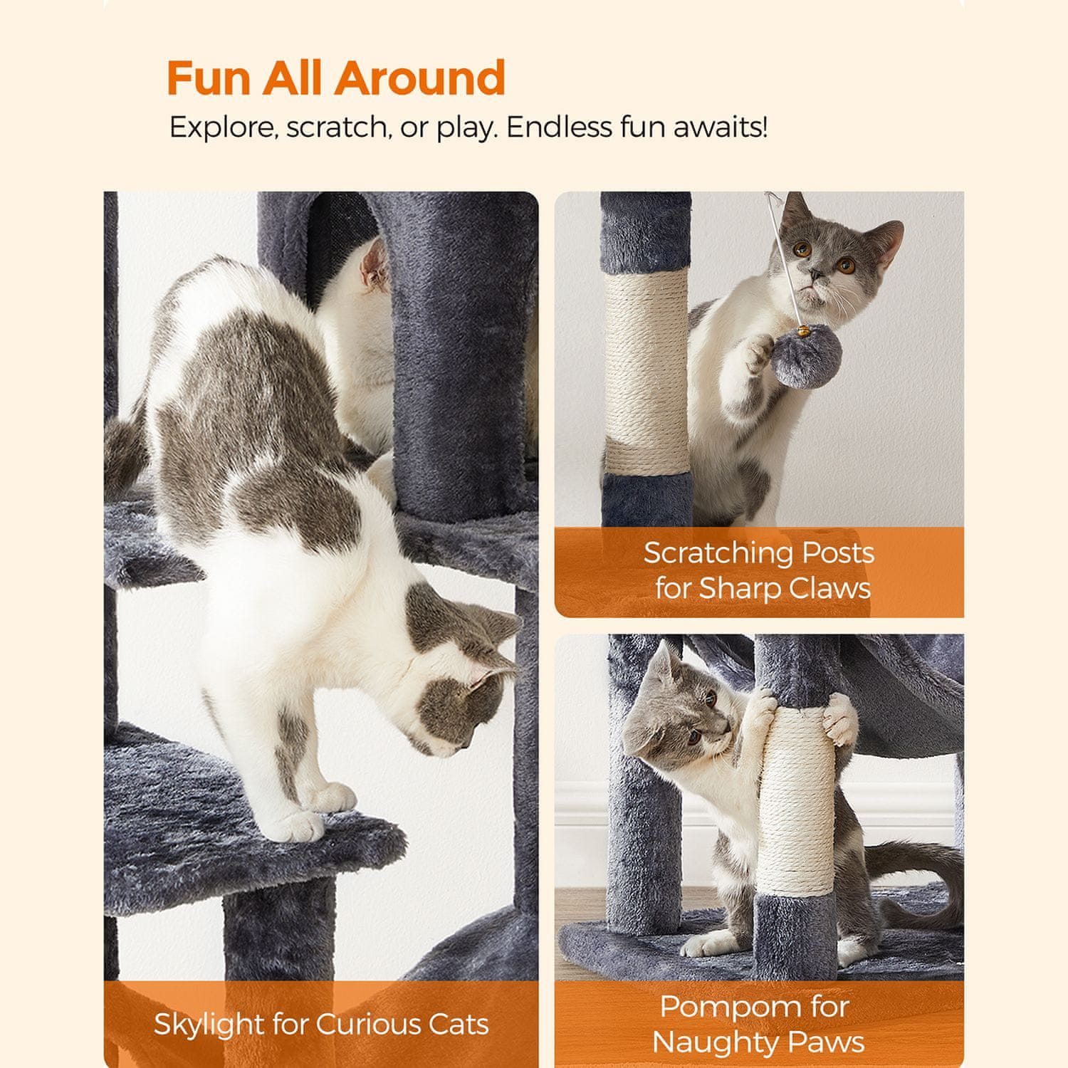 Dajte svojoj mački savršeno mjesto za igru, grebanje i opuštanje s ovim višenamjenskim mačjim tornjem. Dizajniran za stabilnost i udobnost, nudi udobna mjesta za odmor i zabavne aktivnosti koje će vašu mačku zabaviti i usrećiti.
