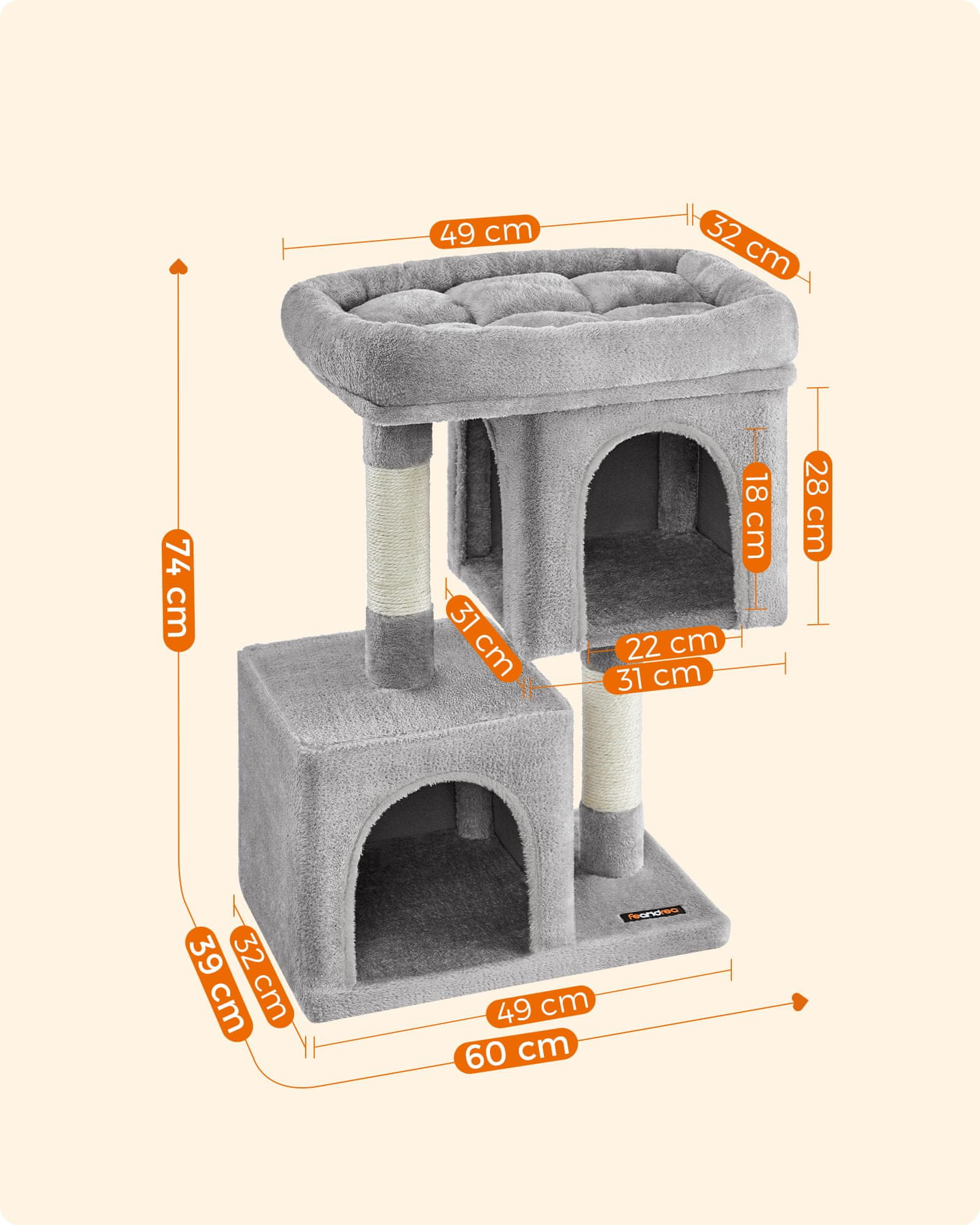 Ovo drvo za mačke pruža udoban prostor vašoj mački za penjanje, grebanje i opuštanje. Uz udobne kućice i prostranu platformu, nudi zabavu i mirno mjesto za odmor za kućne mačke. Idealno za održavanje vaše mačke aktivnom i zadovoljnom.
