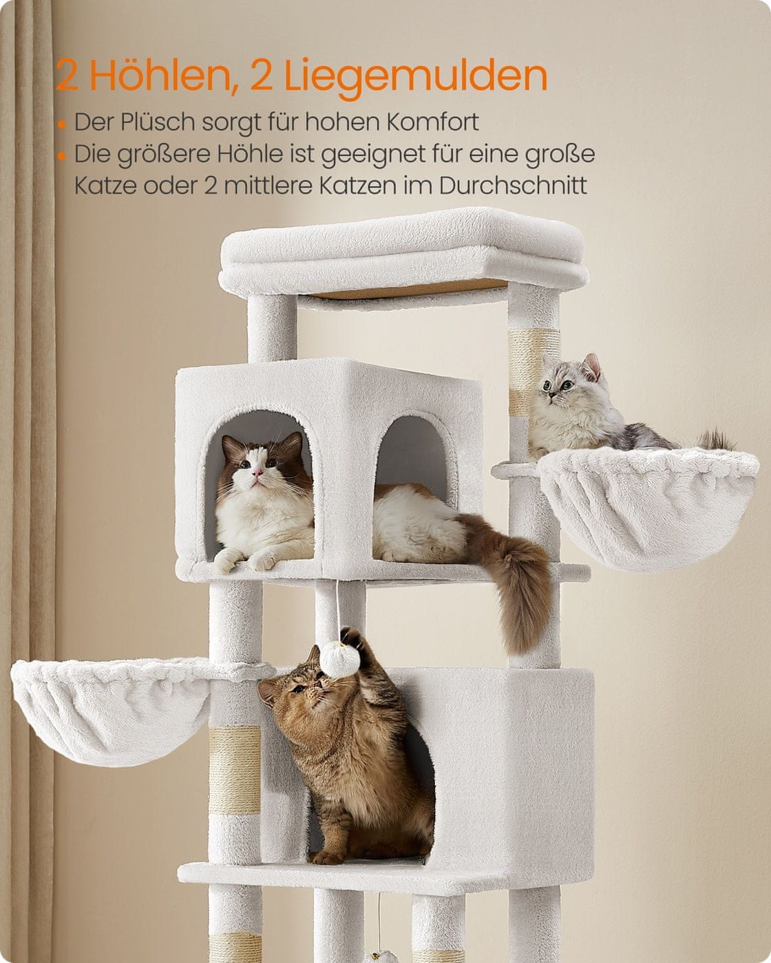 Ovaj višeslojni mačji toranj dizajniran je kako bi vašoj mački pružio udoban i zanimljiv prostor za penjanje grebanje i odmor. S više platformi ugodnih skrovišta i namjenskih stupova za grebanje nudi zabavu i odmor za mačke svih dobi. Čvrsta konstrukcija osigurava stabilnost i trajnost za svakodnevnu upotrebu.
