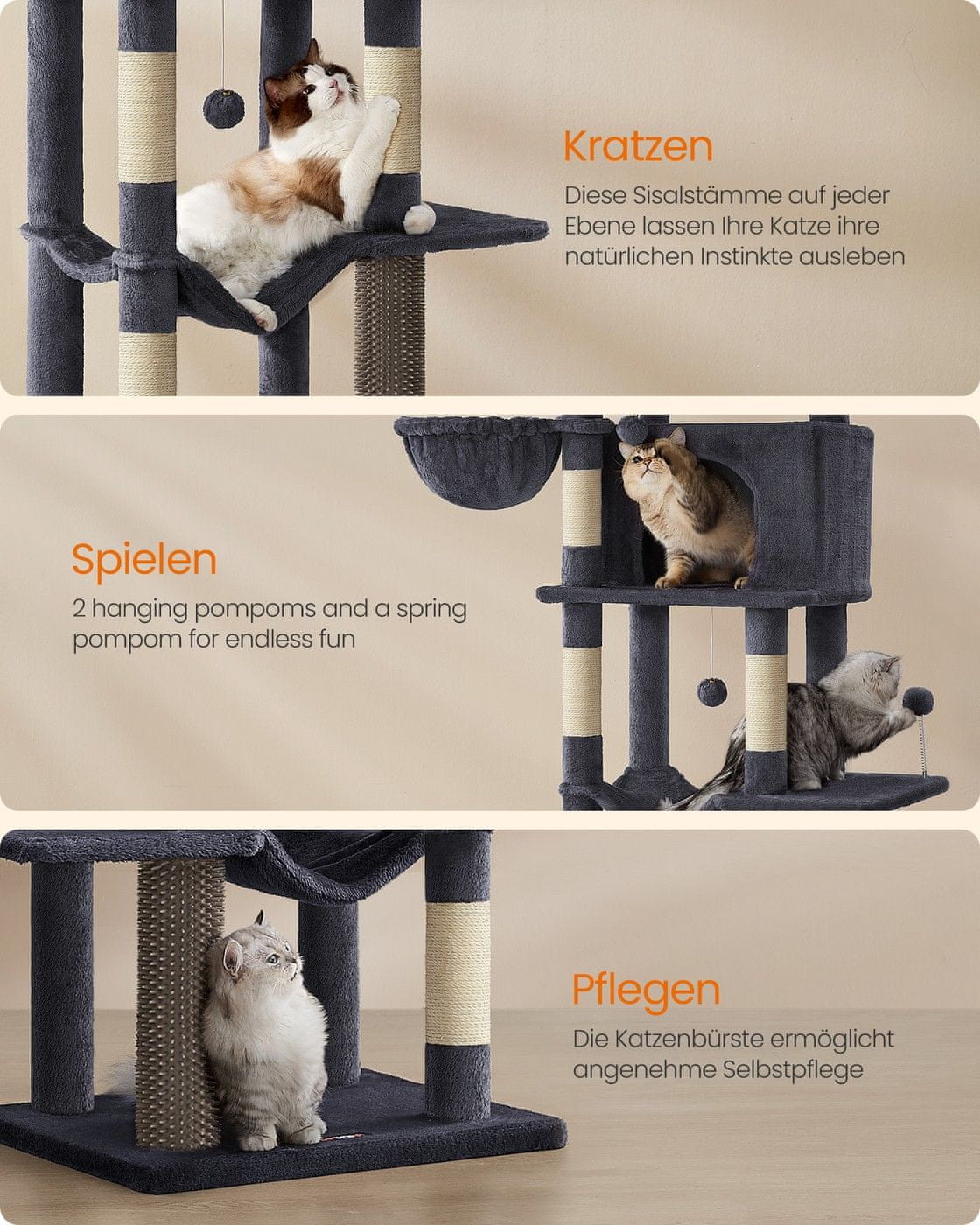 Ovaj višeslojni mačji toranj pruža zanimljivo i udobno okruženje za vašu mačku. Dizajniran s više platformi udobnim špiljama i grebalicama nudi puno prostora za penjanje odmaranje i igru. Idealan za zabavu vaše mačke te pruža posebno mjesto za opuštanje i zadovoljenje njenih prirodnih instinkata.