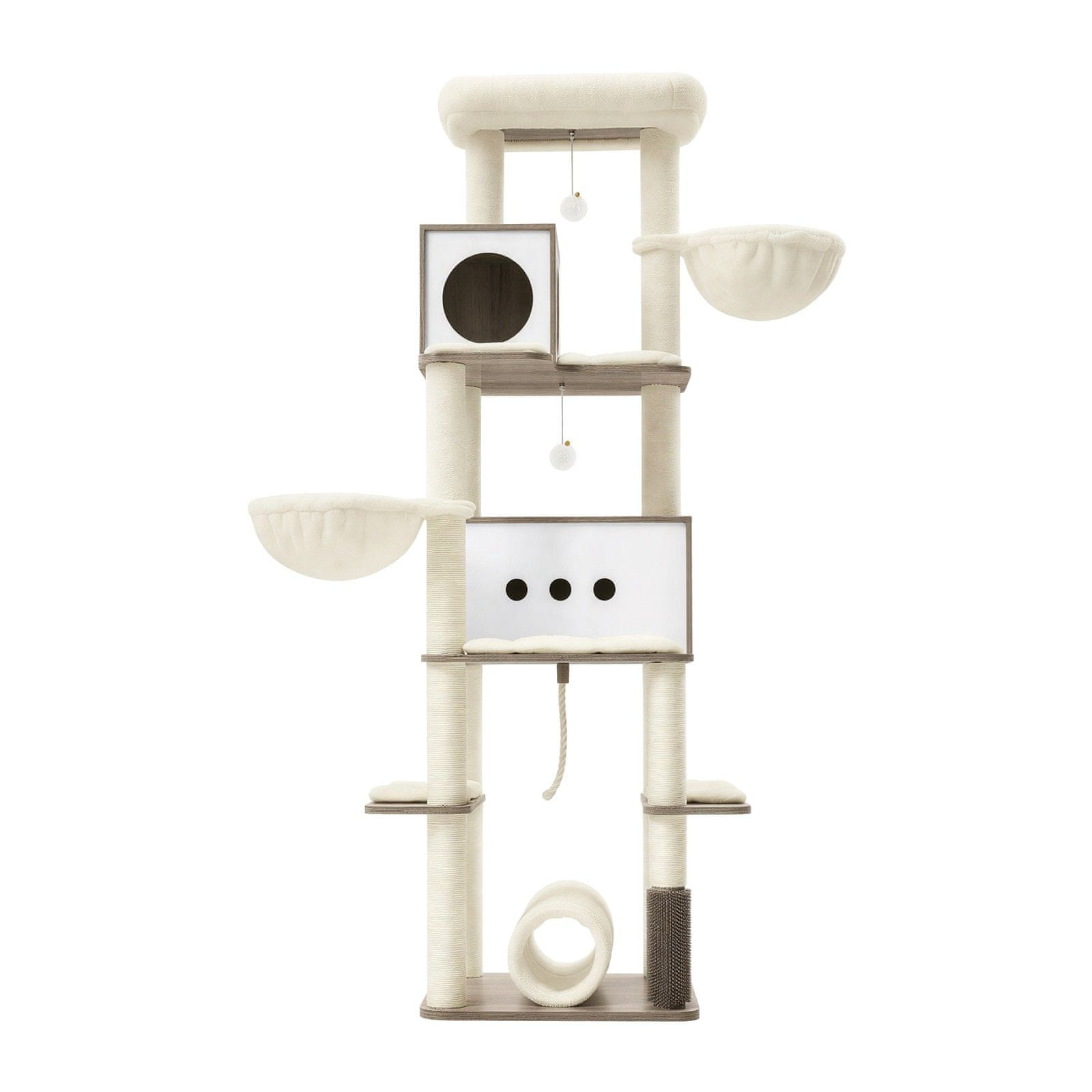 Ovaj moderni višeslojni mačji toranj dizajniran je kako bi mačkama pružio prostrano i zanimljivo okruženje za penjanje grebanje i odmor. S više platformi udobnim špiljama i interaktivnim elementima nudi razne aktivnosti za zabavu i udobnost vaših mačjih ljubimaca. Robusna konstrukcija osigurava stabilnost i sigurnost čineći ga prikladnim za aktivne mačke i kućanstva s više mačaka.