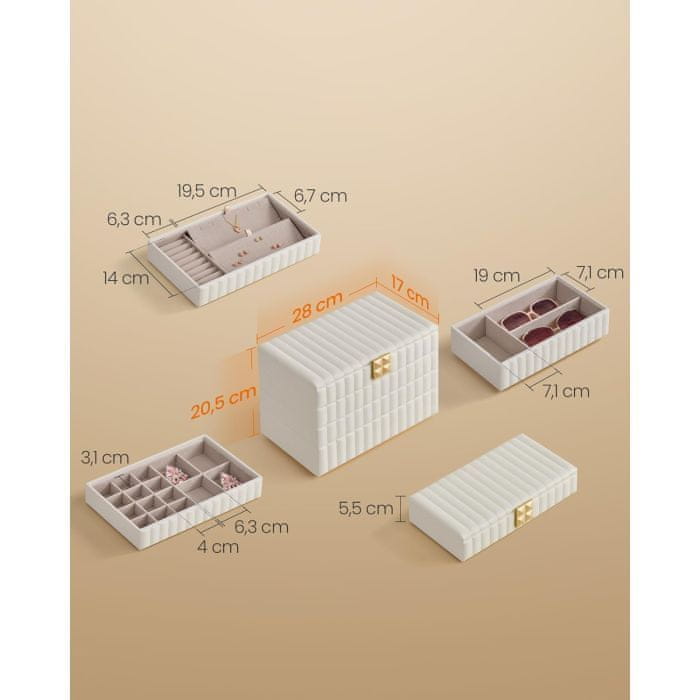 Elegantna i praktična SONGMICS kutija za nakit idealna je za pohranu i organizaciju nakita. Složite ili odvojite razine za optimalno iskorištavanje prostora. Puno prostora za pohranu uz ogledalo za šminkanje.