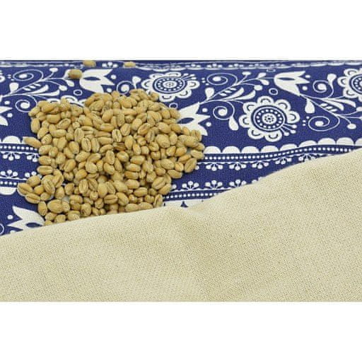 Jastuk od pšeničnog zrna, plavo-bijeli folklor, 25 × 23 cm prikladan je za kućnu upotrebu za toplinske i hladne primjene. Zahvaljujući prirodnom punjenju od pšeničnih zrna, nudi blagotvornu suhu toplinu koja pomaže kod bolova u mišićima, zglobovima, trbuhu ili glavobolji. Može se koristiti i kao hladni oblog.