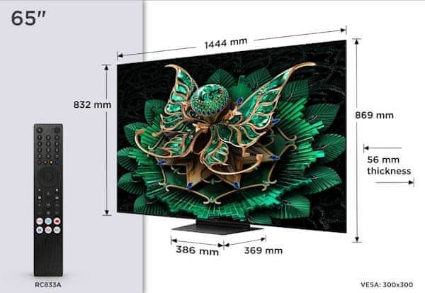 QD-Mini LED HDR Premium TV s dijagonalom od 165 cm (65"). Premium Precise Dimming tehnologija, 144 Hz Motion Clarity Pro, Crystglow HVA panel, svjetlina do 2600 nita, Bang & Olufsen 2.2 zvuk sa 60 W, Dolby Atmos i DTS:X. Uključuje Google TV, HDMI 2.1, Game Master funkcije, ugrađen mikrofon.