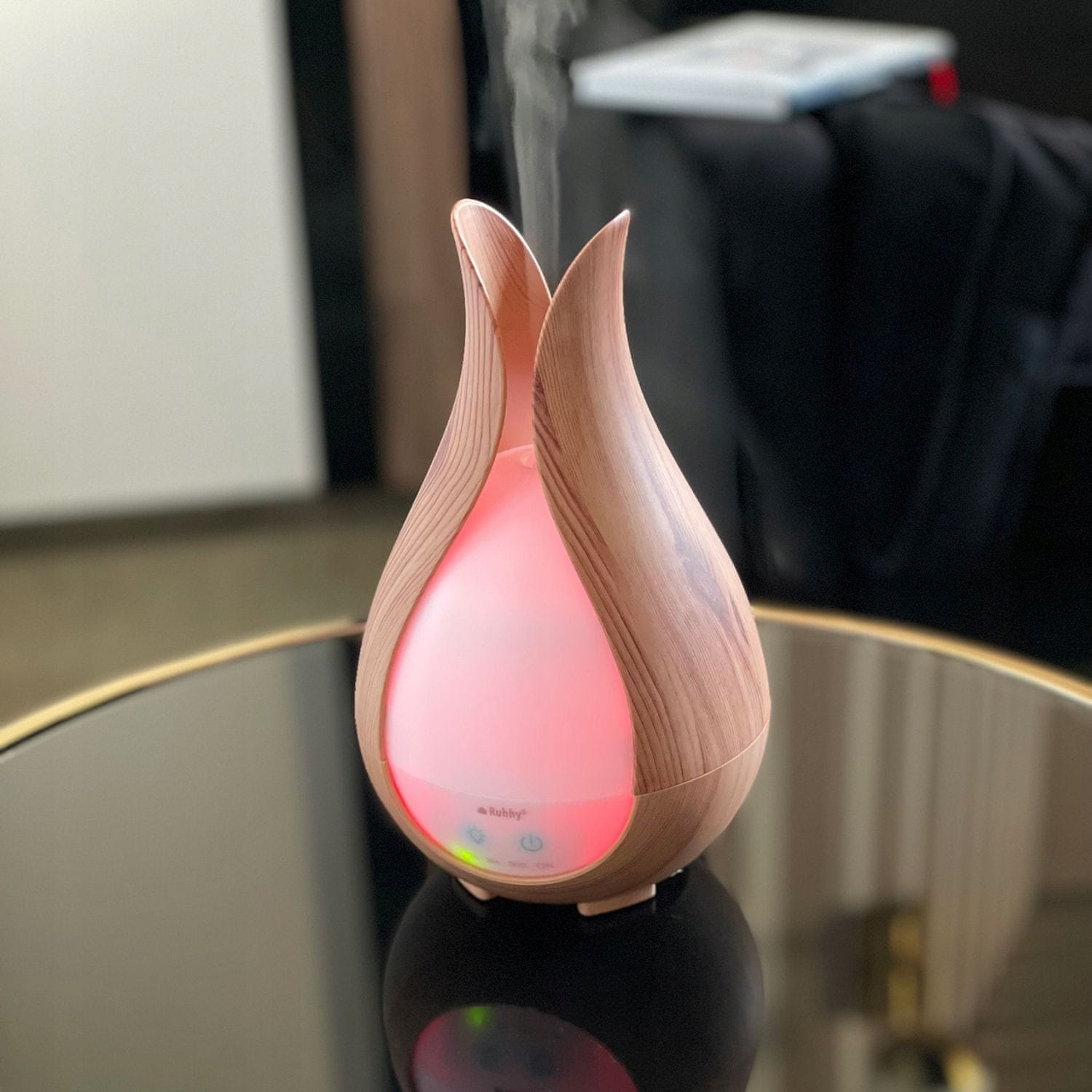 - NAPREDNO LED POZADINSKO SVJETLO – ovlaživač je opremljen s 5 LED dioda koje nude 7 različitih boja pozadinskog osvjetljenja. Svaka boja ima dvije nijanse – tamniju i svjetliju, što omogućuje prilagođavanje atmosfere prema željama korisnika. Pozadinsko osvjetljenje se može kontrolirati posebnom tipkom na prednjoj strani uređaja. Prvi način pozadinskog osvjetljenja automatski mijenja boje, što osigurava opuštajuću i dinamičnu igru svjetla. Korisnik također može prilagoditi intenzitet pozadinskog osvjetljenja ili ga potpuno isključiti ovisno o raspoloženju.