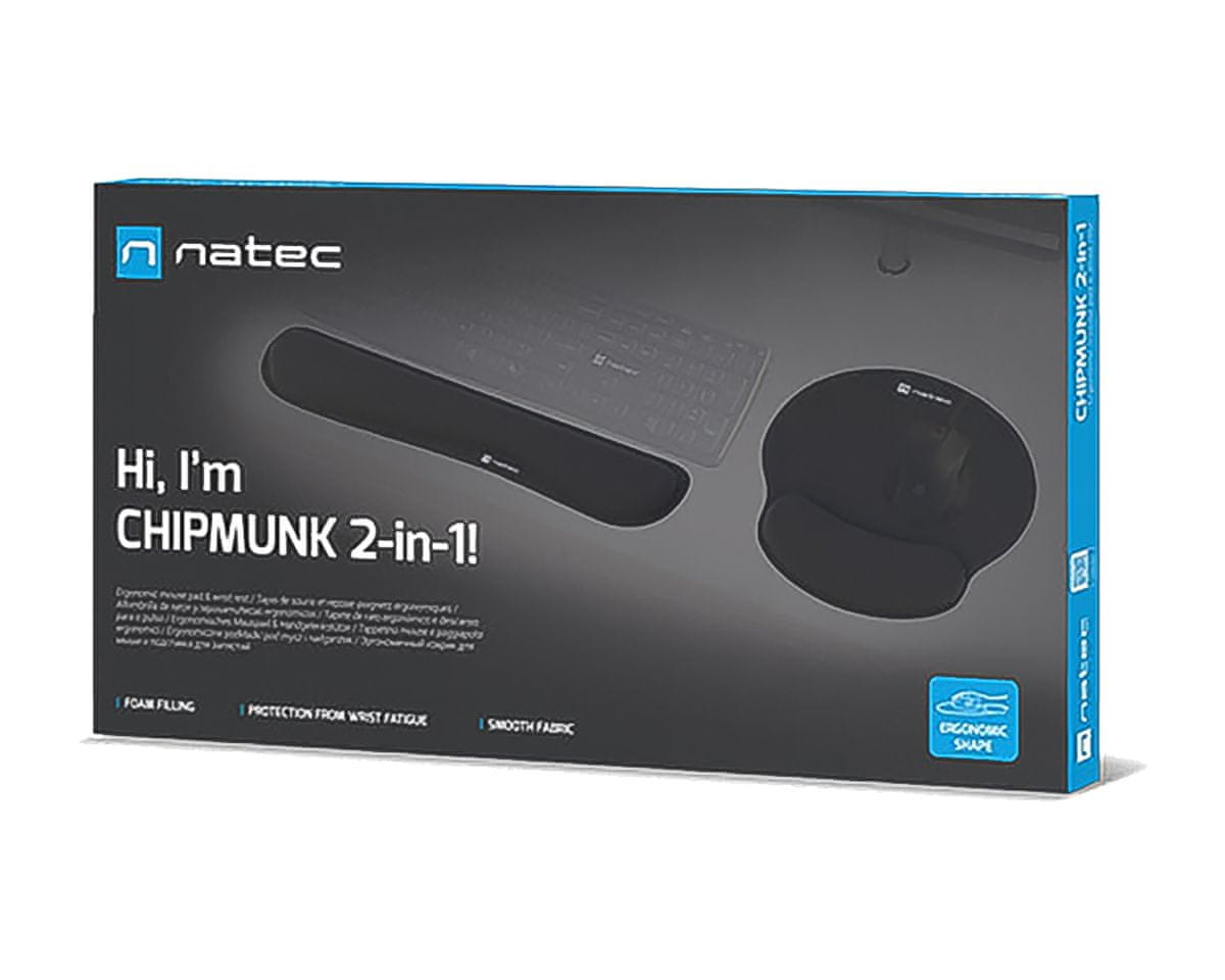 Želite povećati svoju produktivnost, ali bol u zglobu to sprječava? Upoznajte Natec Chipmunk 2in1 – set koji se sastoji od ergonomskog naslona za ručni zglob dizajniranog za tipkovnicu i podloge za miša. Visokokvalitetni materijali i memorijska pjena učinit će da zaboravite na bol i fokusirate se na najvažnije stvari.