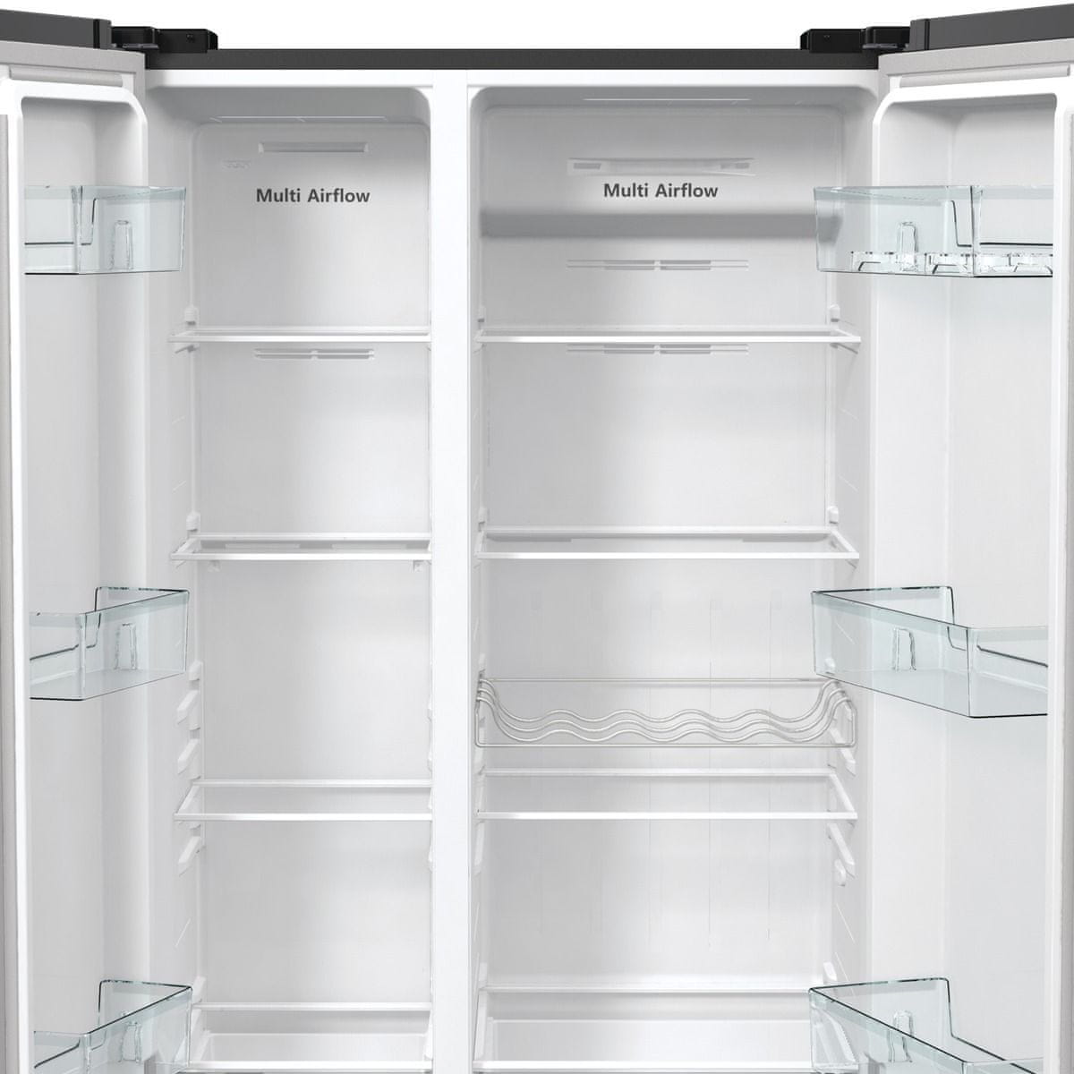 Američki hladnjak sa zamrzivačem Hisense RS711N4AFE pripada energetskom razredu E. Može se pohvaliti ukupnim volumenom od 505 litre, od čega 358 litara u rashladnom dijelu i 192 litara u zamrzivaču. Zahvaljujući kutu otvaranja vrata od 90 stupnjeva i dubini koja odgovara dubini kuhinjskog pulta, ovaj samostojeći hladnjak idealan je za svaku modernu kuhinju.