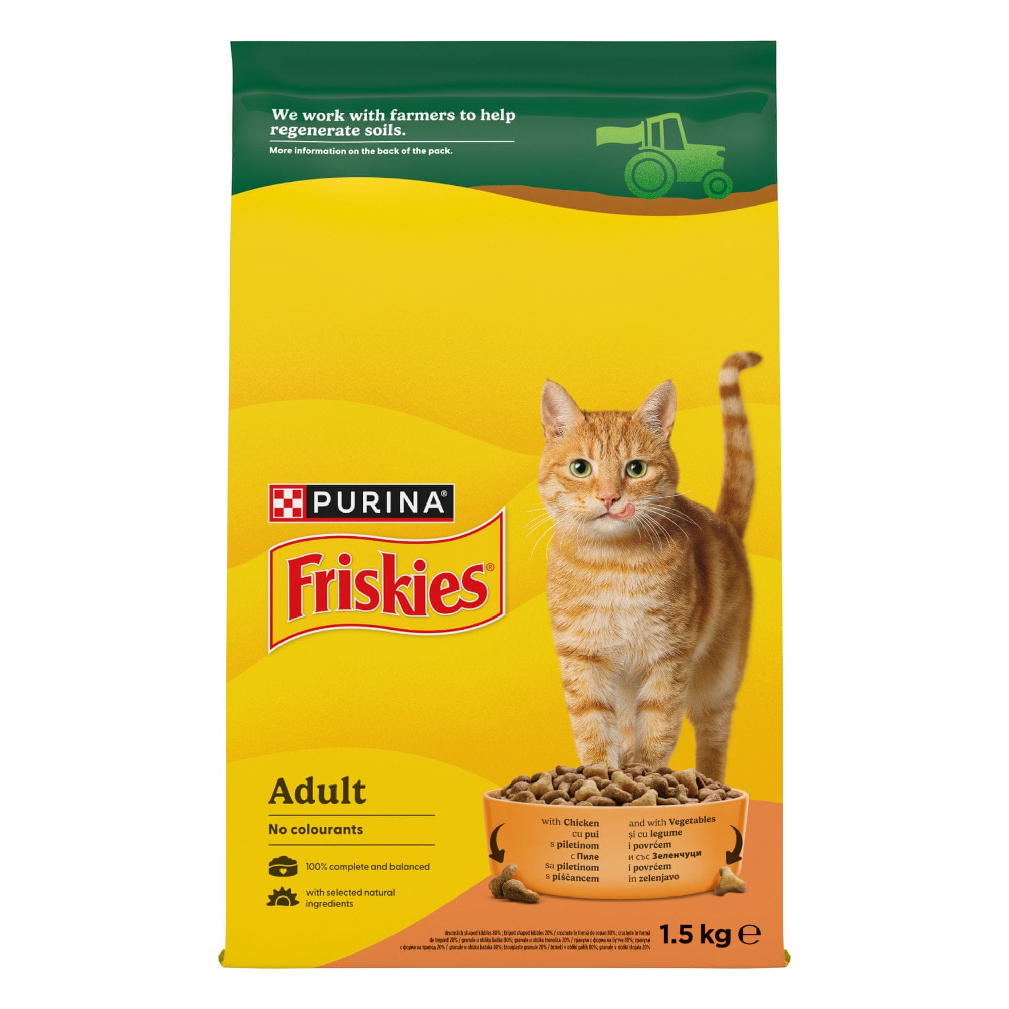 FRISKIES® Adult s piletinom i povrćem potpuna je i uravnotežena suha hrana koja vašoj odrasloj mački osigurava sve potrebne hranjive tvari za zdrav i aktivan život. Izrađena od pažljivo odabranih prirodnih sastojaka bez umjetnih bojila, ova hrana podržava zdravu probavu, mokraćni sustav te jake kosti i zube zahvaljujući dodatku vitamina D. Slastan okus piletine pružit će vašem ljubimcu užitak u svakom obroku. Cijeli opis