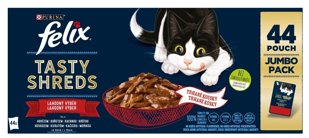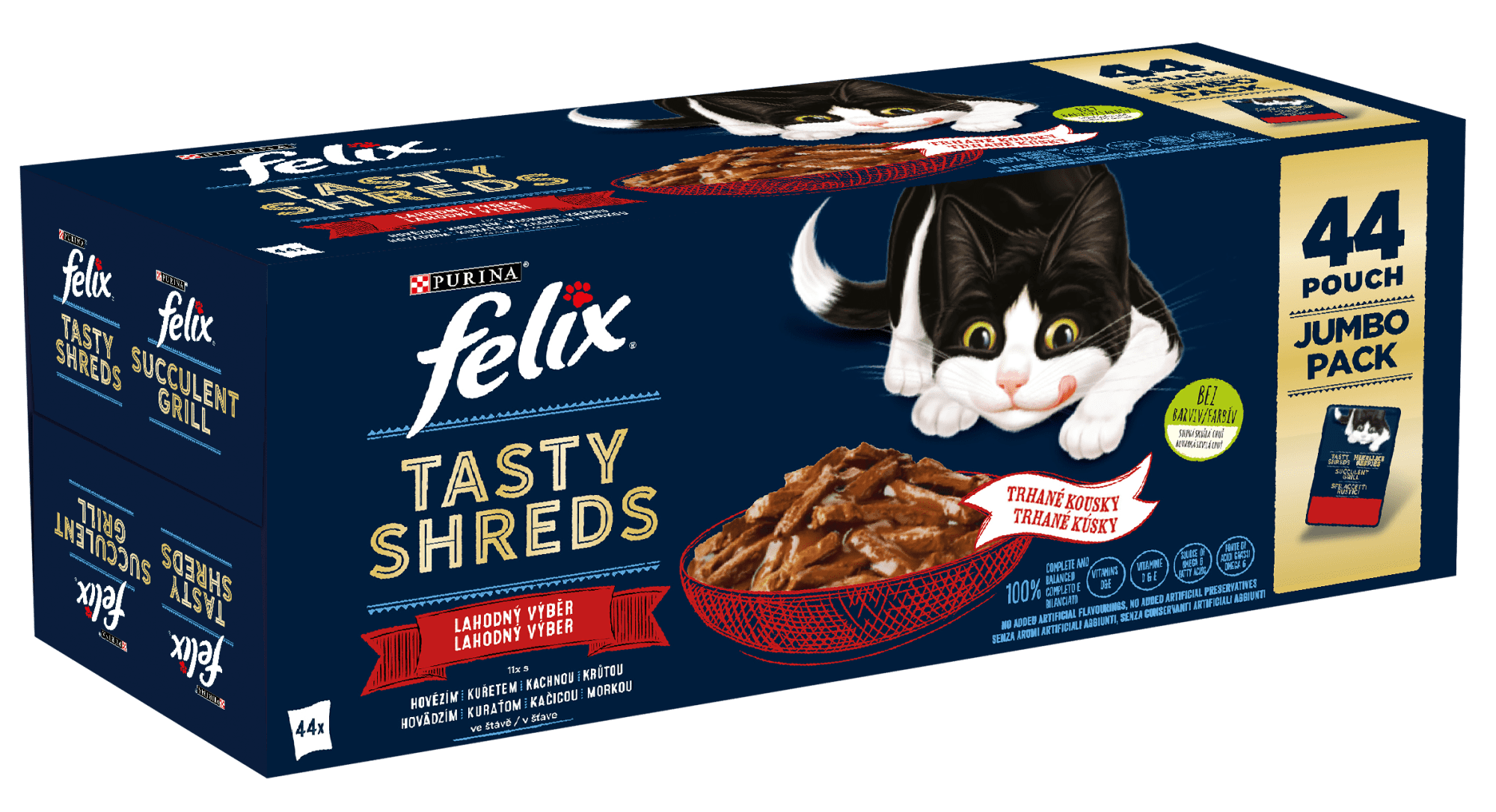 FELIX Tasty Shreds su mekani i neodoljivi sirovi zalogaji u ukusnom soku koje će vaša mačka voljeti! Oni su izvor esencijalnih omega-6 masnih kiselina i sadrže pravu kombinaciju vitamina kako bi vaša mačka bila puna života i spremna za vježbanje!