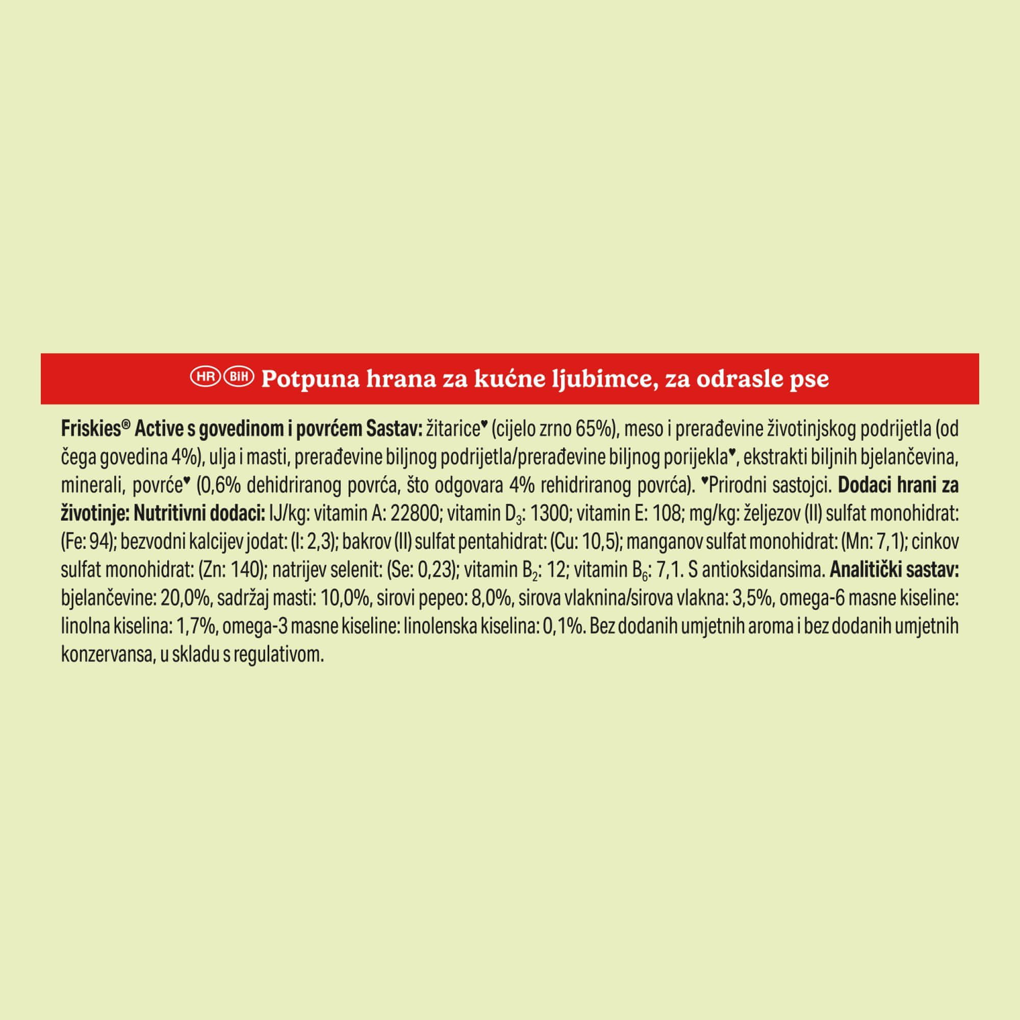 PURINA® Friskies® Active prilagođena je odraslim psima koji su puni energije i uvijek se vole igrati. Naši recepti nude 100% potpunu i uravnoteženu prehranu, napravljenu od pažljivo odabranih prirodnih sastojaka za održavanje razine energije vašeg psa.