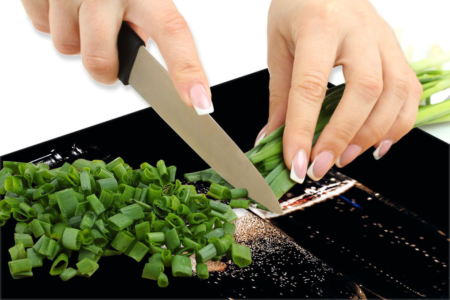 ✔ Staklena daska za rezanje – higijenska i otporna na mirise, idealna za sjeckanje povrća, mesa ili kruha.