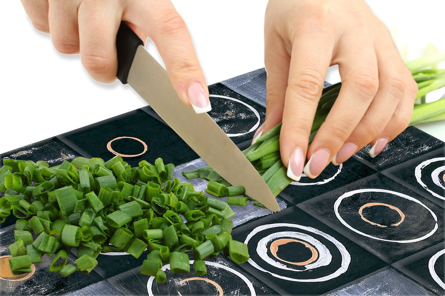 ✔ Staklena daska za rezanje – higijenska i otporna na mirise, idealna za sjeckanje povrća, mesa ili kruha.