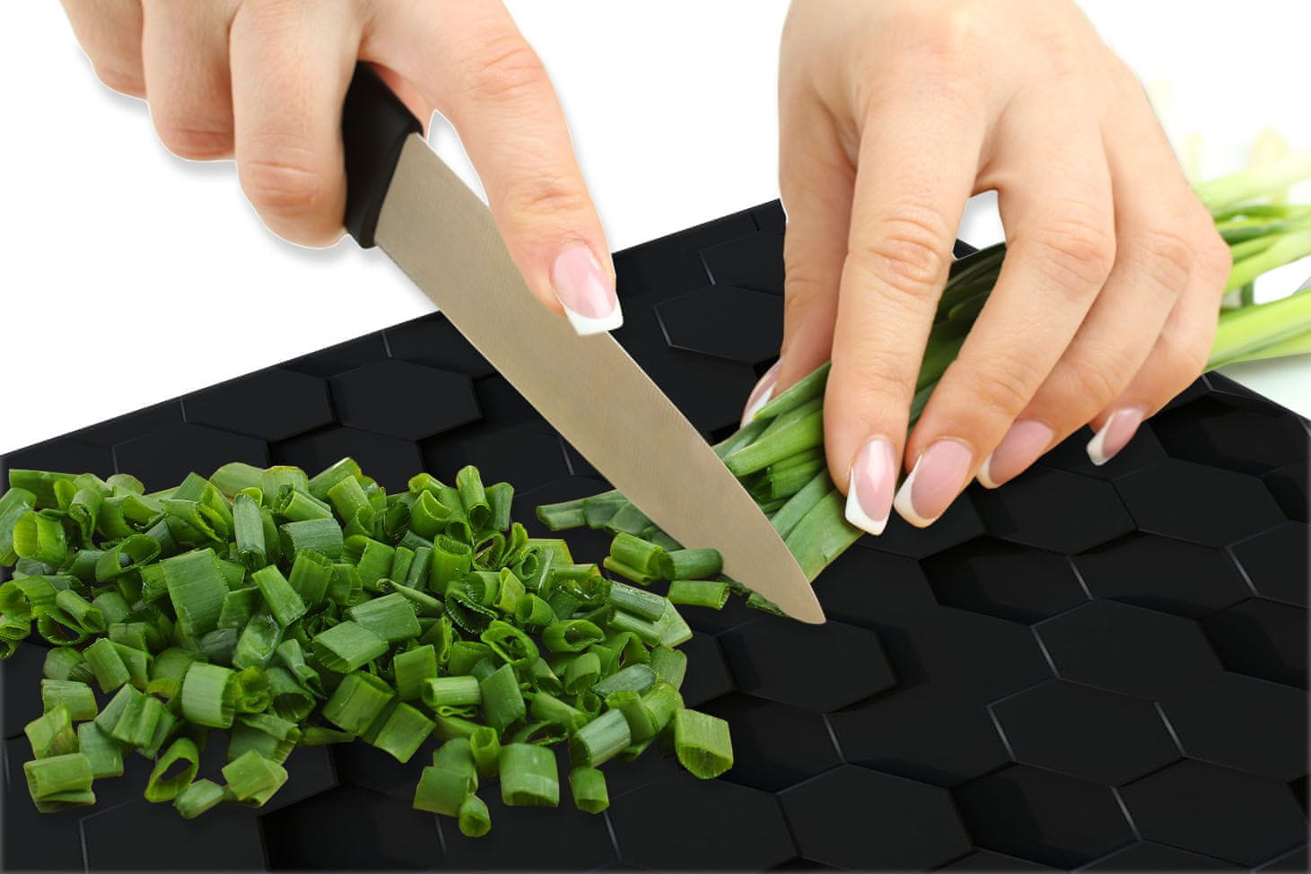✔ Staklena daska za rezanje – higijenska i otporna na mirise, idealna za sjeckanje povrća, mesa ili kruha.