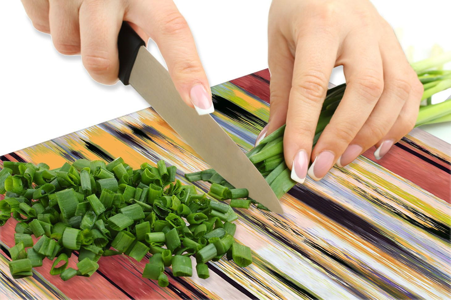 ✔ Staklena daska za rezanje – higijenska i otporna na mirise, idealna za sjeckanje povrća, mesa ili kruha.