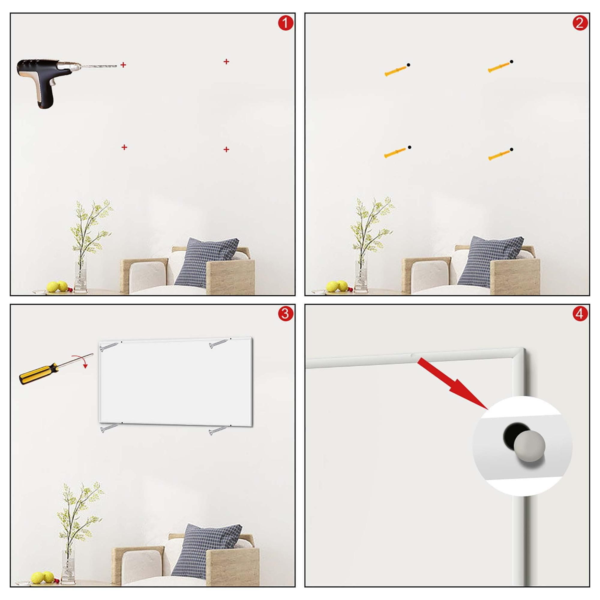 Ploča dimenzija 1220 × 770 × 15 mm namijenjena je isključivo za zidnu montažu. — Budući da tijekom rada može doseći između 80 C i 100 C, kućni ljubimci, djeca i osobe kojima je potrebna pomoć ne smiju se ostavljati bez nadzora. Ne prekrivajte radijatore!