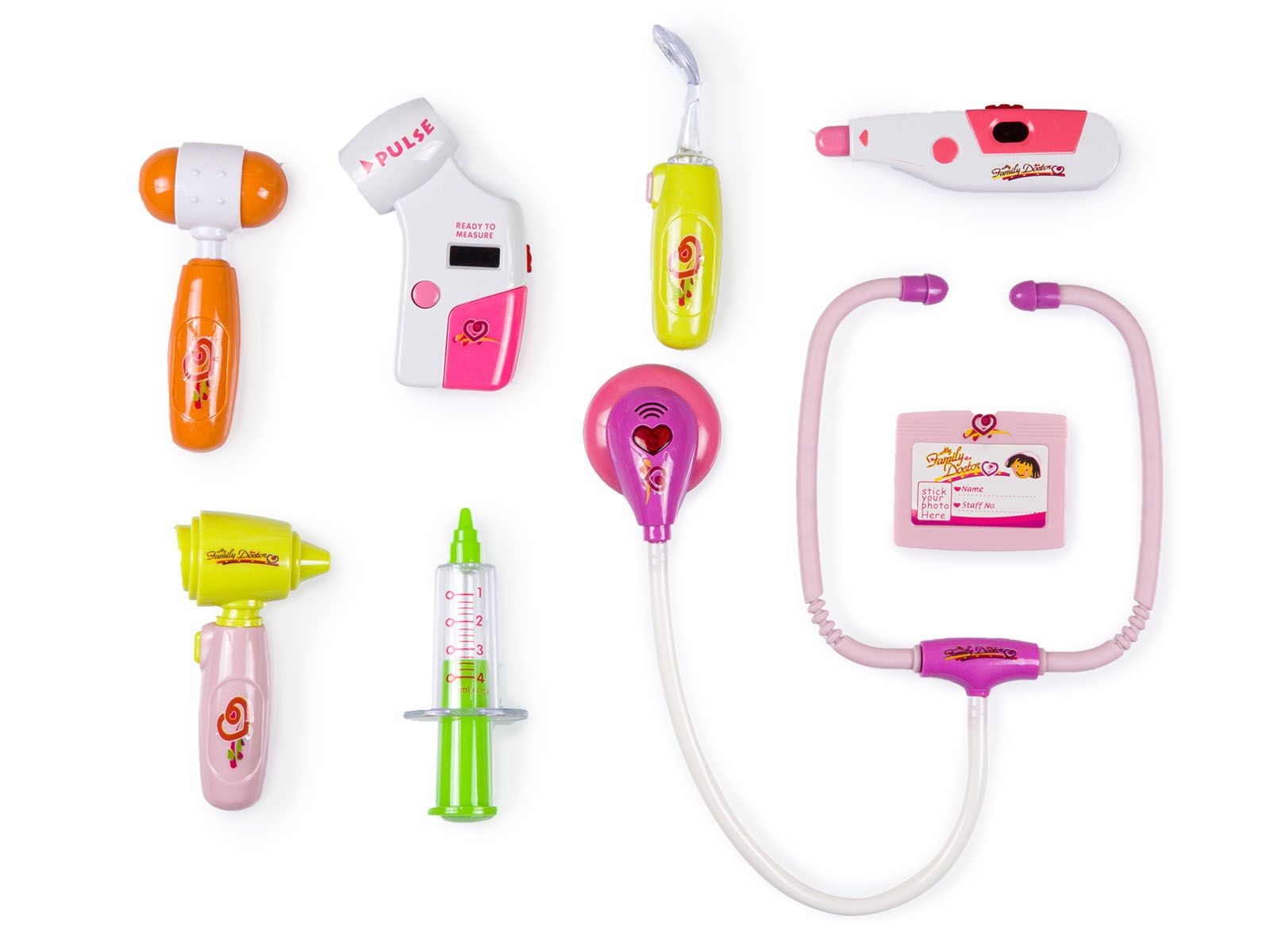 Edukativna igračka, set malih liječnika za djecu. Zvučni i svjetlosni efekti. Set uključuje: čekić, stetoskop, termometar, injekcijsku štrcaljku, flaster, medicinsko zrcalo, otoskop. Napajanje: 2 baterije AG13, 8 baterija AG10 (uključene u isporuku).