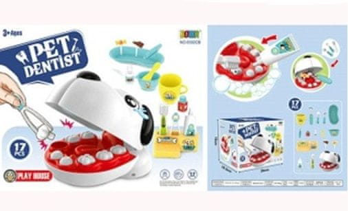 Sjajan set – pas kod zubara. Svidjet će se svakom malom djetetu. Dijete će se tako naviknuti na posjet zubaru. Vaše dijete može razvijati svoju manualnu spretnost pečateći i popravljajući zube svojih psećih pacijenata. Dimenzije. glava psa: 18×12,5×16cm.