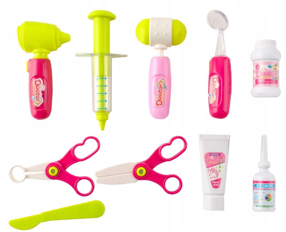 Kontrolni zaslon ima razne zvučne tipke koje tijekom rada emitiraju zvukove poput pravog uređaja, npr. Šarene svjetleće diode dodaju atraktivnost proizvodu. Kada se pritisne, stetoskop se oglašava zvučnim signalom i svijetli svjetlo u obliku srca. Toplomjer i mjerač otkucaja srca imaju klizač za podešavanje očitanja i svjetleći zaslon. Otoskop i stomatološko ogledalo opremljeni su rasvjetom.Elementi su pažljivo izrađeni od zdravstveno sigurnih materijala. Imaju glatke rubove, a njihov oblik olakšava hvatanje i čvrsto držanje u ruci. Set će otkloniti dosadu i omogućiti vam učenje o ljudskom tijelu. Potaknut će vašu maštu, upoznati vas sa zanimanjem liječnika i osvijestiti potrebu brige o svom zdravlju. Dijete može igrati ulogu liječnika ili pacijenta te razvijati socijalne i integracijske vještine igrajući se s drugima u grupi.Igračka je univerzalna i prikladna i za djevojčice i za dječake.Izvrsna ideja za poklon za mnoge prigode!- KOLICA + 18 ELEMENATA – broj dijelova omogućuje praktičnu upotrebu seta; 18 medicinskih instrumenata i kolica na 2 razine s imitacijom EKG ekrana i ručkom omogućuju raznoliku, kreativnu i višestruku zabavu.