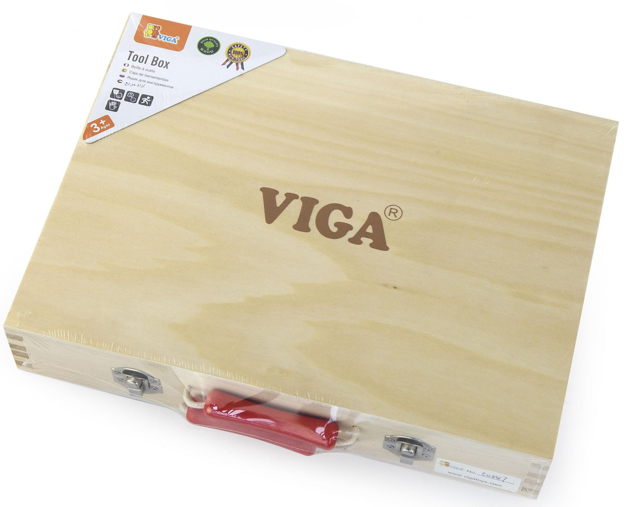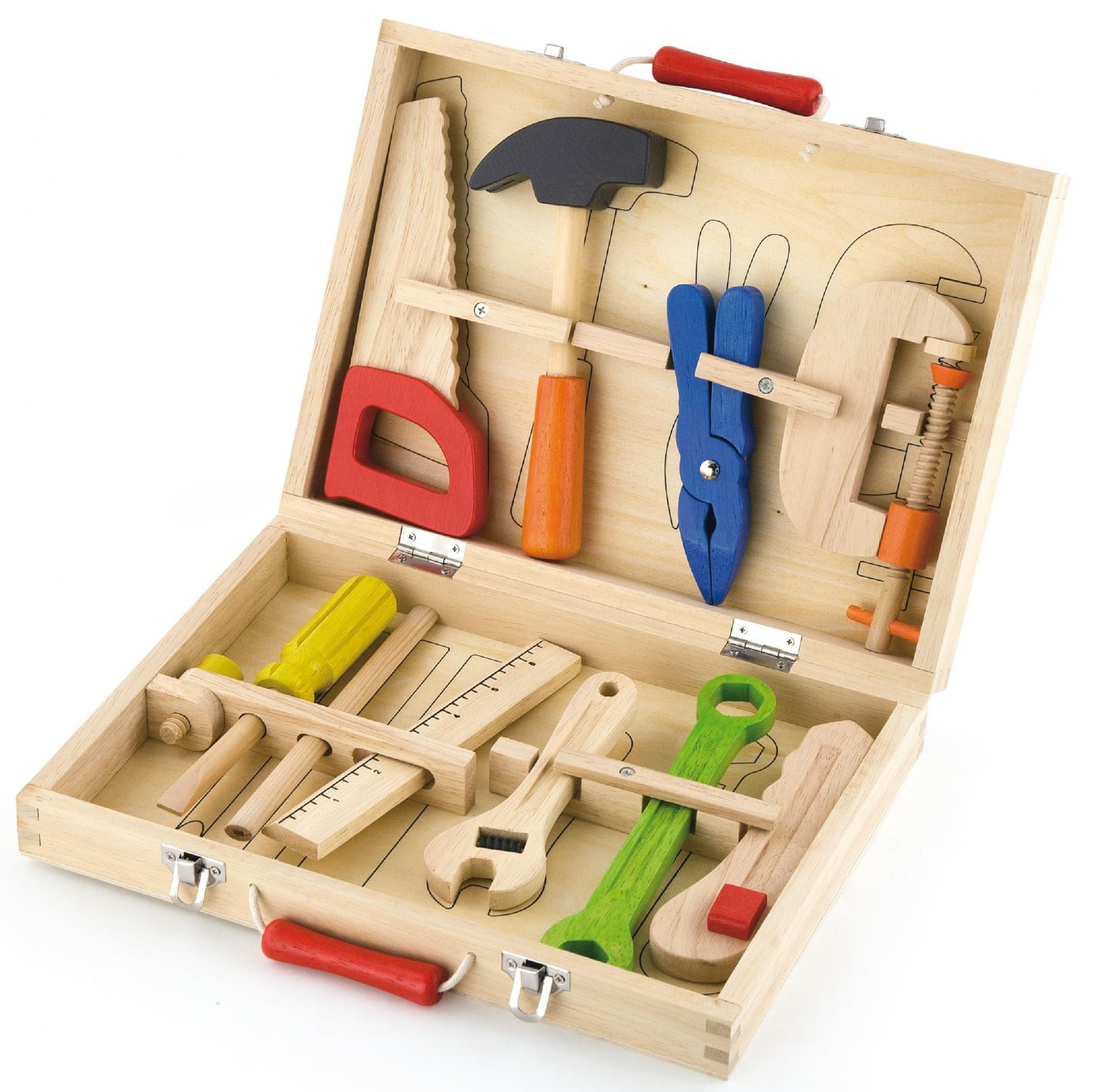 Drveni alat spakiran u praktično drveno kućište. Paket sadrži ukupno 10 vrsta alata. Ovaj putni kofer pogodan je za svakog malog majstora koji voli pomagati ocu, na primjer u radionici. Cijeli opis