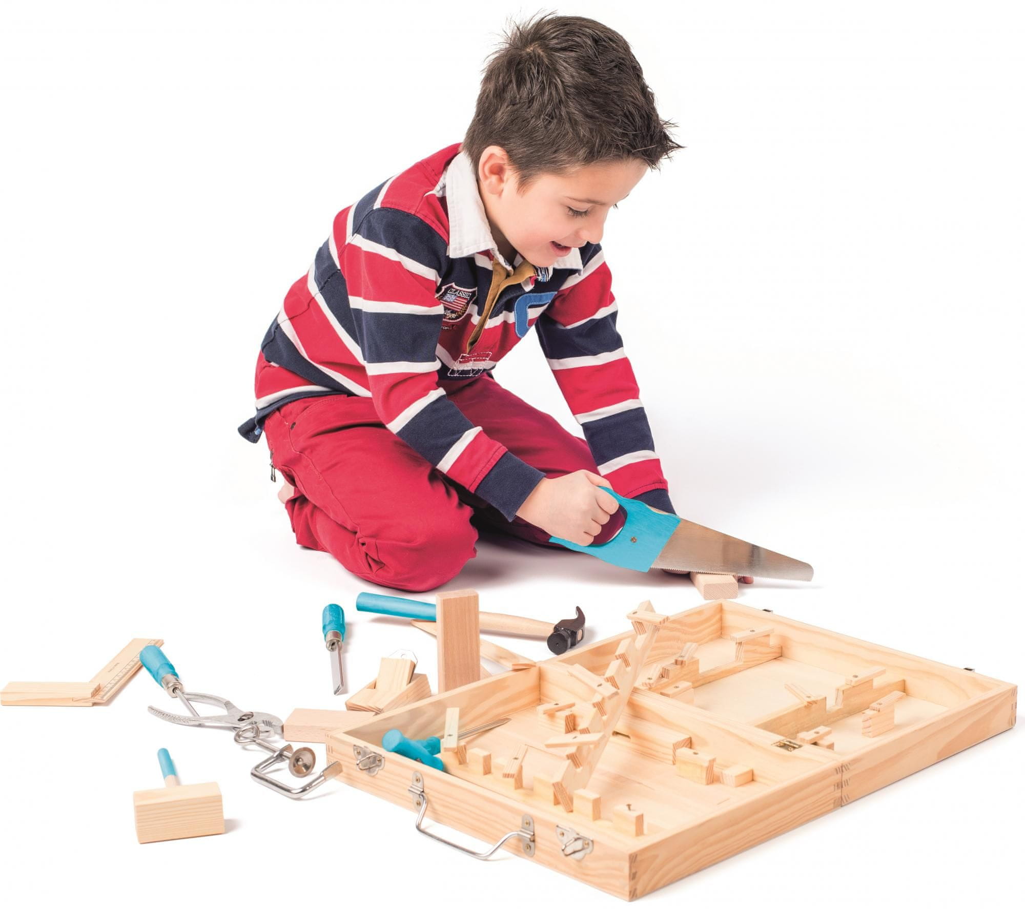 Drveni kofer sadrži 16 metalnih i drvenih alata, s kojima će mladi majstori pomoći u popravcima i usput puno naučiti.