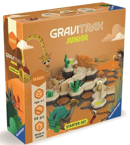GraviTrax Junior je interaktivni sustav s loptom za djecu od 3 godine naviše. Mališani grade vlastite svjetove od staza s lopticama koje mogu dekorirati po želji stvarajući individualne tematske svjetove. Uz GraviTrax Junior Desert Starter Set, koji sadrži razne građevinske i ukrasne dijelove, djeca mogu odmah uroniti u sušni pustinjski svijet.
