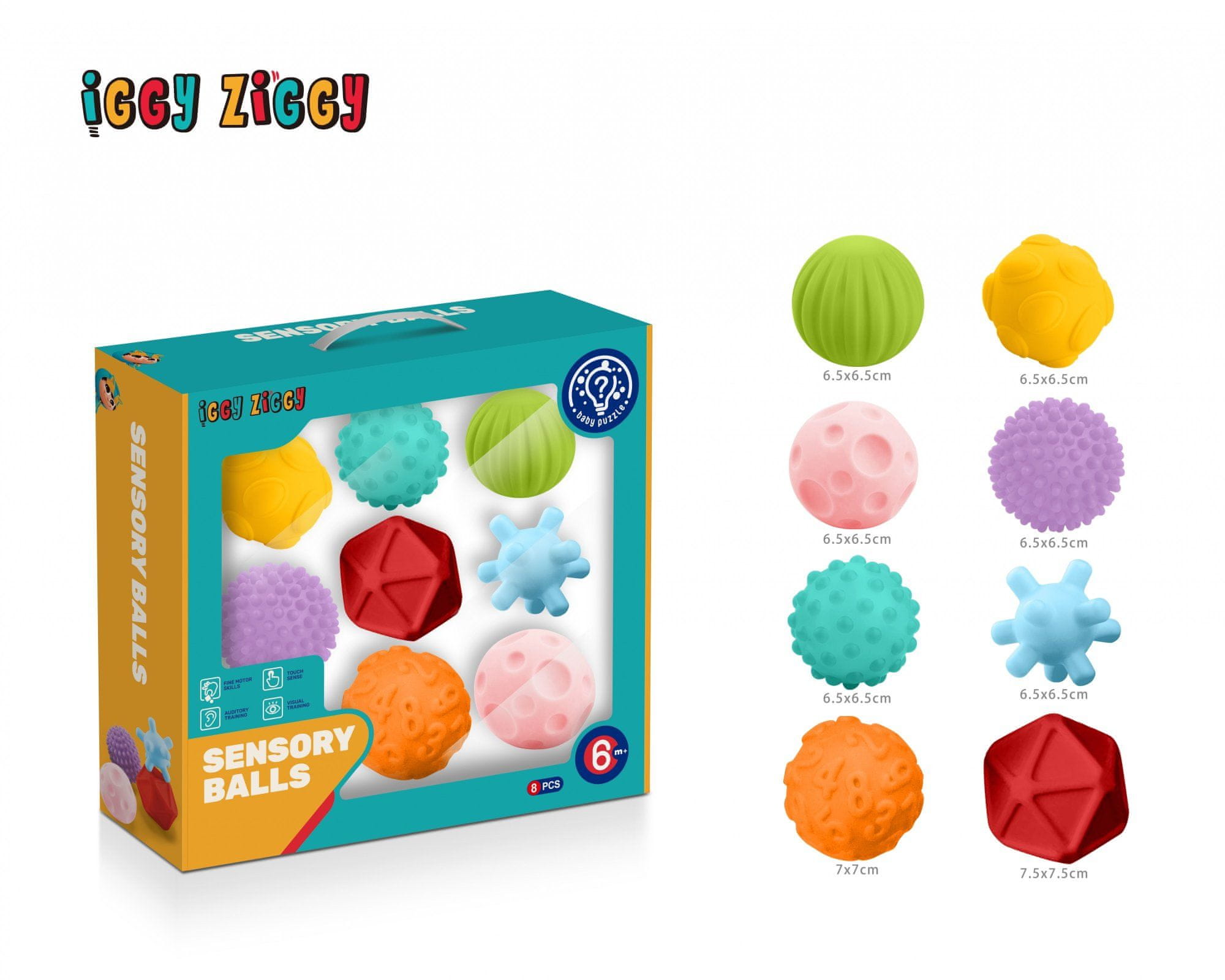 Iggy Ziggy gumene lopte raznih veličina i šarenih boja. Različite teksture, boje i dimenzije potiču dječju znatiželju i jačaju motoriku u igri s njima. Cijeli opis