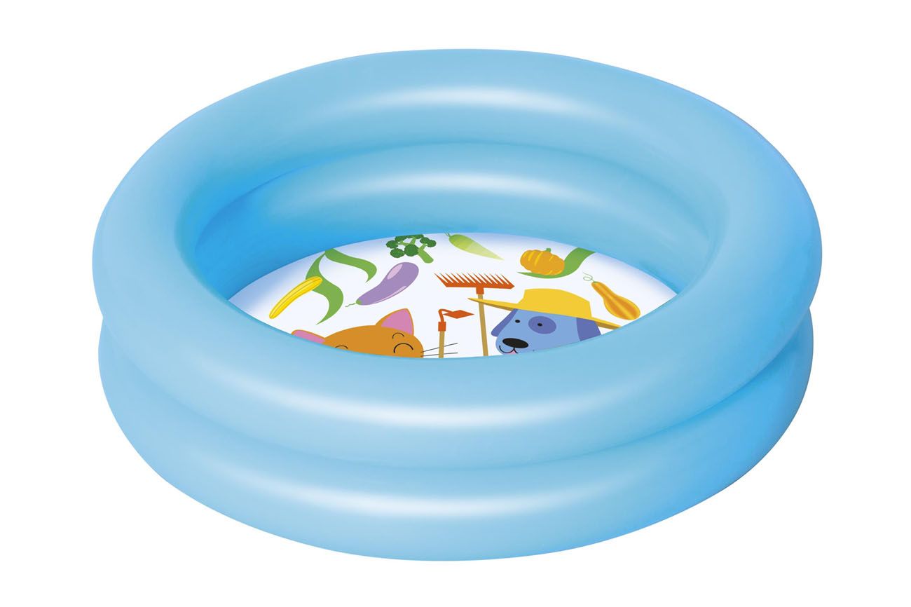 Mali dvokomorni napuhljivi bazen, 61 × 15 cm, pogodan za djecu do tri godine, kapacitet vode (75%) 21 l. Dostupne su dvije boje – plava, ružičasta + dno s otiskom. Specifikaciju boje potrebno je navesti prilikom narudžbe.