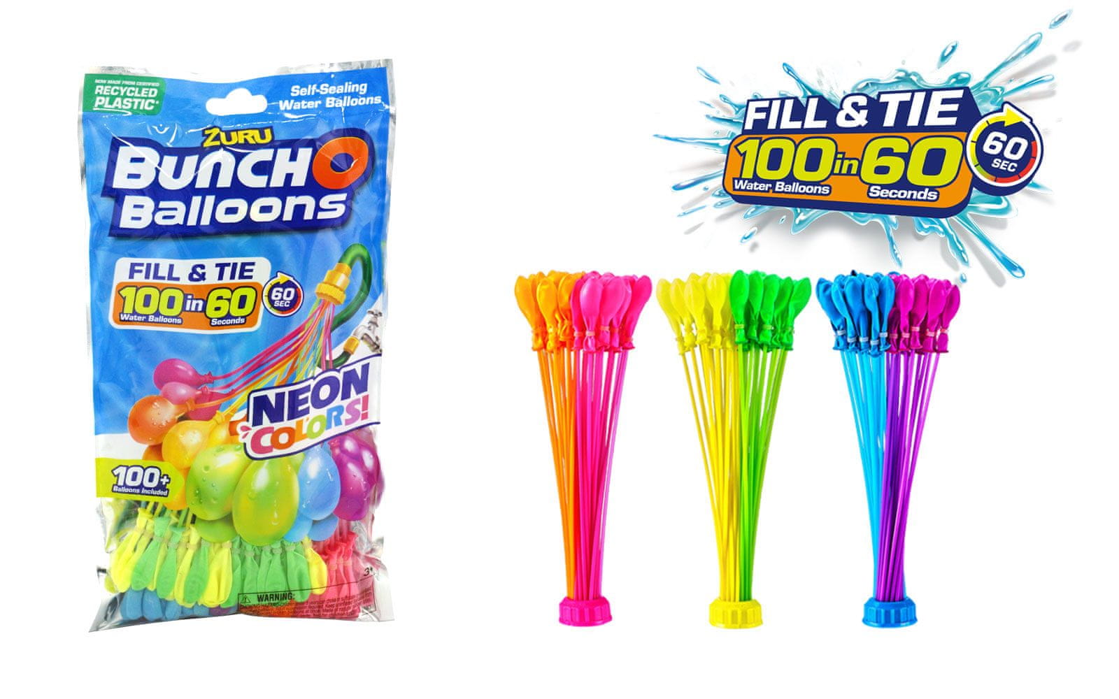 Vodeni baloni Bunch O Ballons su u paketu s oko 35 balona koji se mogu puniti vodom u isto vrijeme. Vodeni baloni se obvezuju! Baloni su različitih neonskih boja.
