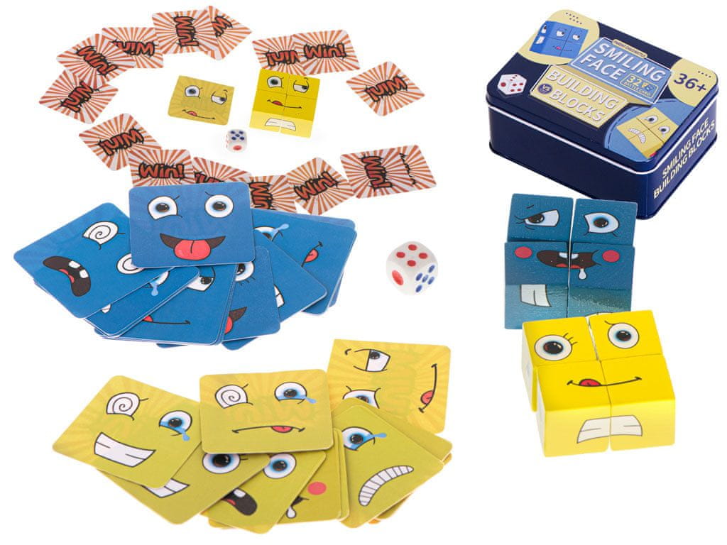 Logička igra – zadaci koji mijenjaju lice. Igra se sastoji od izvlačenja kartice sa smajlićem i slaganja odgovarajućeg lica od blokova u izvučenoj boji. U vrtu.: 8 kockica, kocka i 26 karata. Pakirano u praktičnoj limenci. Dimenzije pakiranja: 12,5×9,5×5,5 cm.
