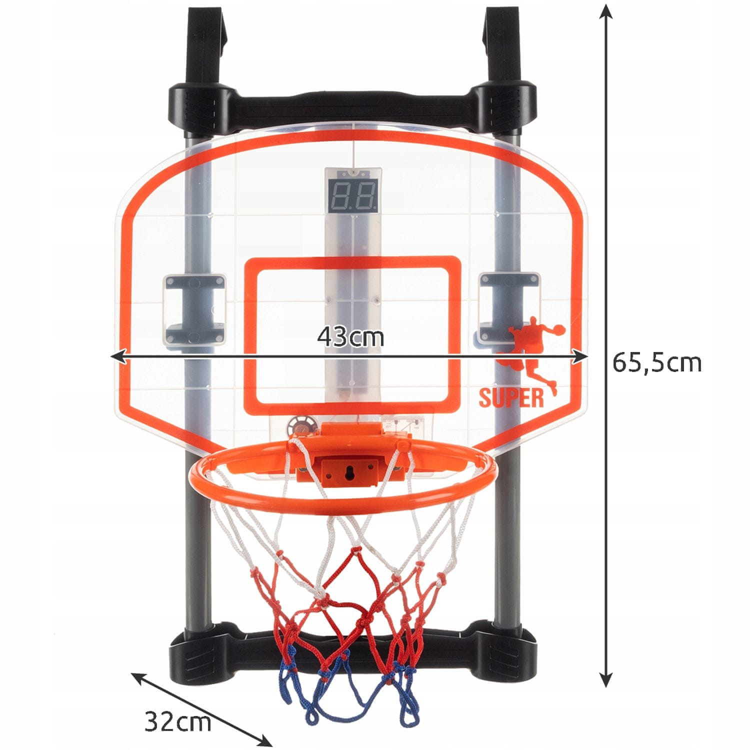 - TABLA + ZVUCI – u kompletu se nalazi i semafor koji omogućuje praćenje broja pogodaka. Uređaj napajajte samo baterijama. Nakon pogađanja koša, semafor pokazuje broj pogodaka i broji bodove za svako bacanje. Dodatna prednost ove igračke je odbrojavanje i zvuk pogotka.