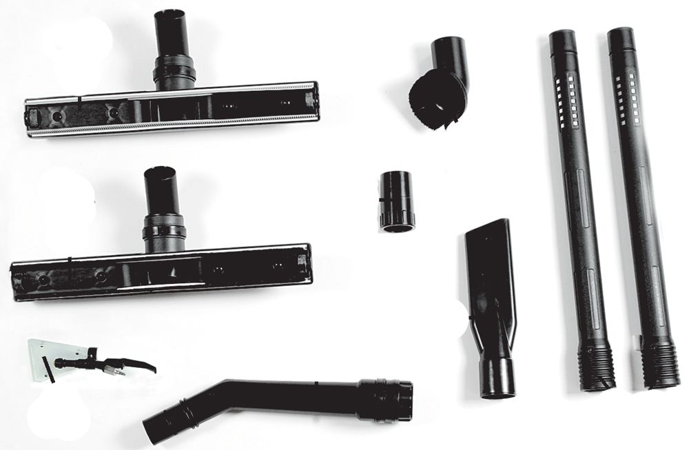 Osnovna oprema: usisna cijev 2,5 m, rezervoar za deterdžent, set za suho usisavanje, 2 x metalni nastavak, četka za suho i mokro usisavanje, okrugla četka, nastavak za usisavanje iverja, set za kemijsko čišćenje: širok i uzak nastavak