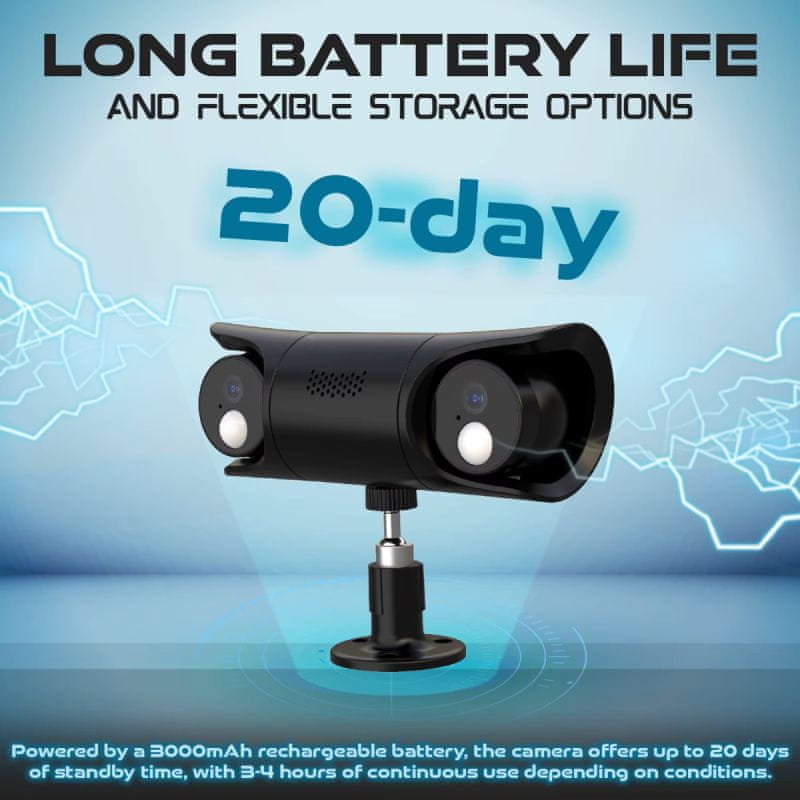 Zahvaljujući ugrađenoj bateriji od 3000 mAh kamera traje do 20 dana u stanju pripravnosti. Noćni vid s IR diodama osigurava čistu sliku i u potpunom mraku (do 10 m). Funkcija dvosmjernog zvuka omogućuje ne samo praćenje nego i komunikaciju u stvarnom vremenu.