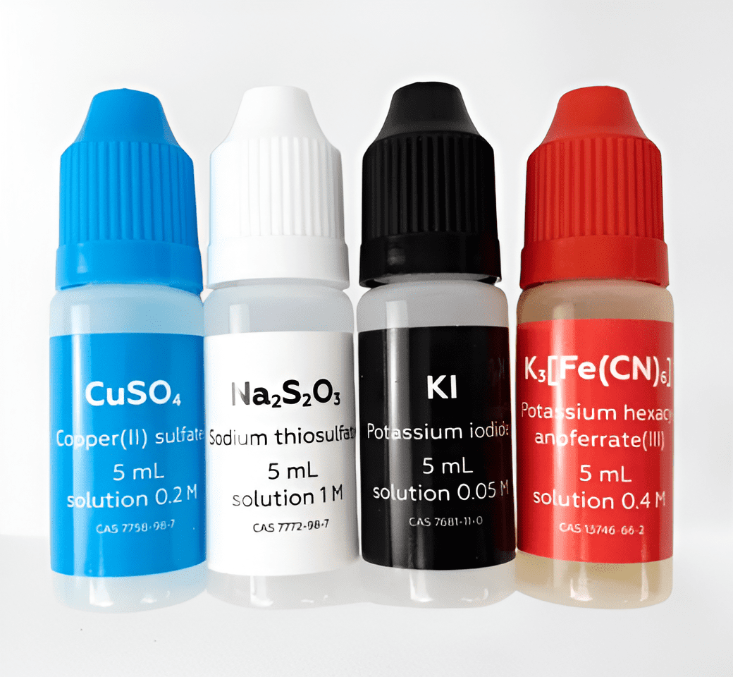 • Sadržaj Seta: Bakar(II) sulfat, Kalijev heksacijanoferat(III), Kalijev jodid, Natrijev tiosulfat, Zaštitna podloga, 2 x Bež papir, 6 x Veliki pamučni cilindar, 3 x Mali pamučni cilindar, Kartica eksperimenta, Nitrilne rukavice, 2 x Otvarač, Drveni štapić, Zaštitne naočale.