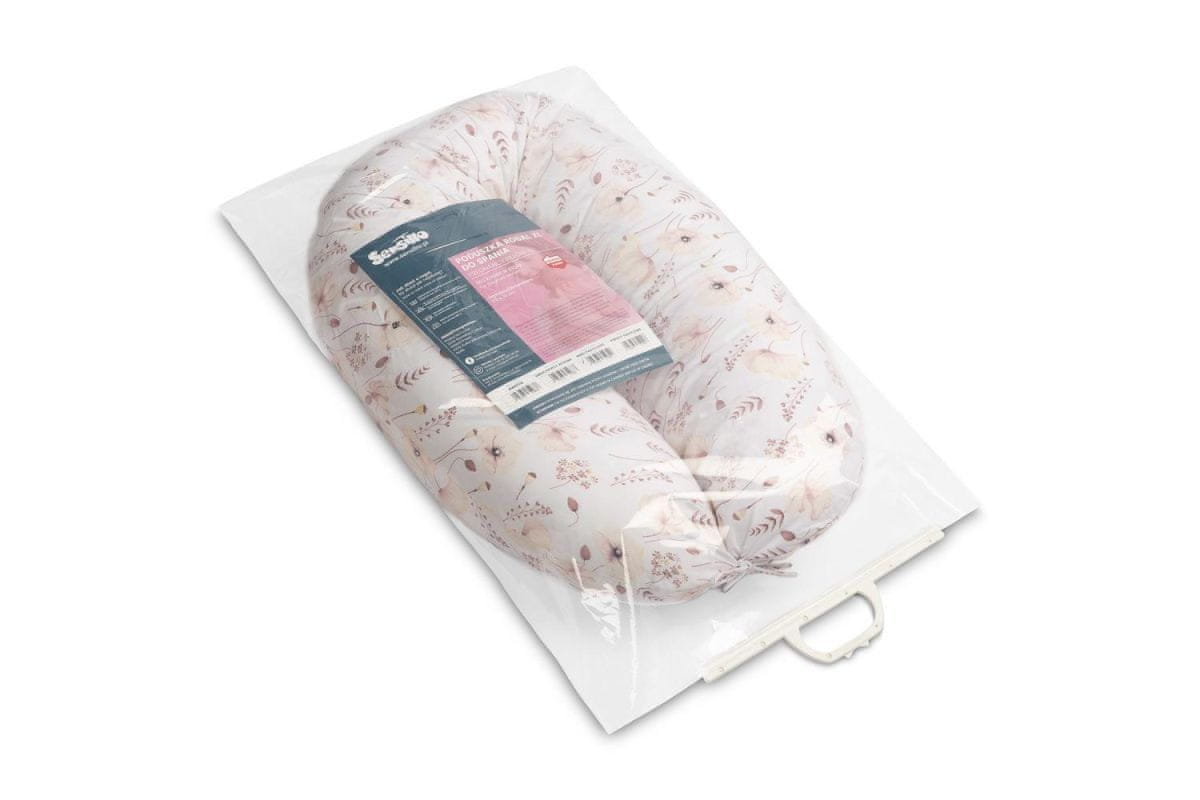 Jastuk za dojenje s nježnim uzorkom bež cvjetića donosi toplinu i udobnost u svakodnevne trenutke majke i djeteta. Već tijekom trudnoće pruža ugodnu potporu za opuštanje leđa i nogu, nakon poroda olakšava dojenje i rasterećuje kralježnicu.