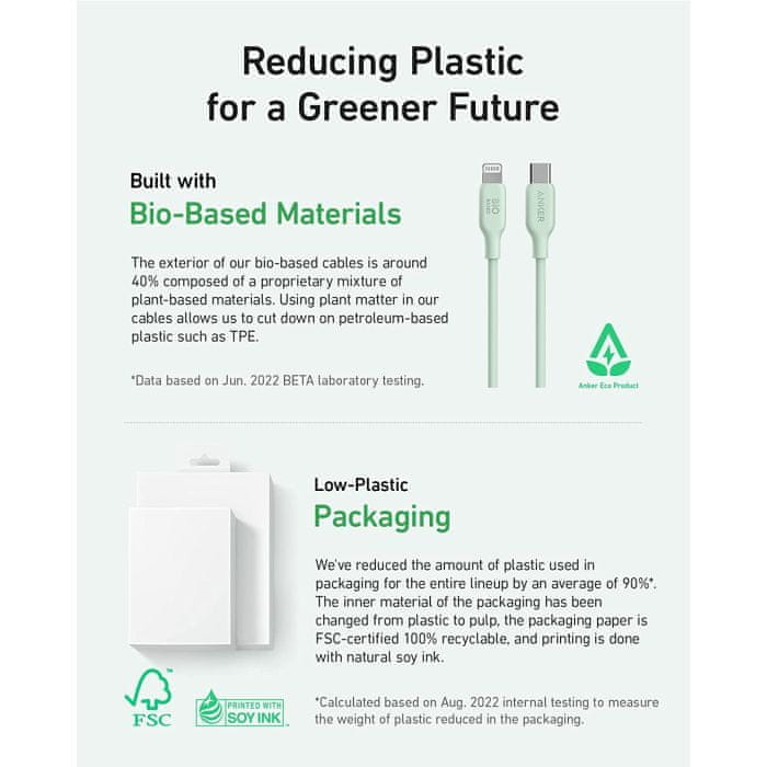 Anker 541 BIO USB-C-LTG 1,8m kabel zelen – biološki kabel iz rastlinskih materialov, vzdržljiv do 20.000 upogibov. Podpira hitro polnjenje, združljiv z USB-C napravami. Na voljo v različnih barvah in dolžinah. Embalaža s FSC certifikatom, manj plastike.