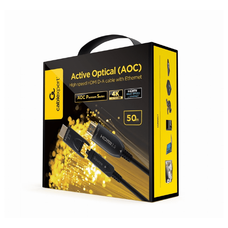 Aktivni optički HDMI D (micro) -A (AOC) kabel od 50 m koristi tehnologiju optičkih vlakana za prijenos digitalnog HDMI signala. To znači da se signal može prenijeti puno dalje nego s tradicionalnim bakrenim kabelom (do 100 m) i smanjuje rizik od EMI/RFI smetnji. HDMI AOC kabeli također imaju ugrađene namjenske bakrene žice za napajanje, tako da vanjsko napajanje nije potrebno.