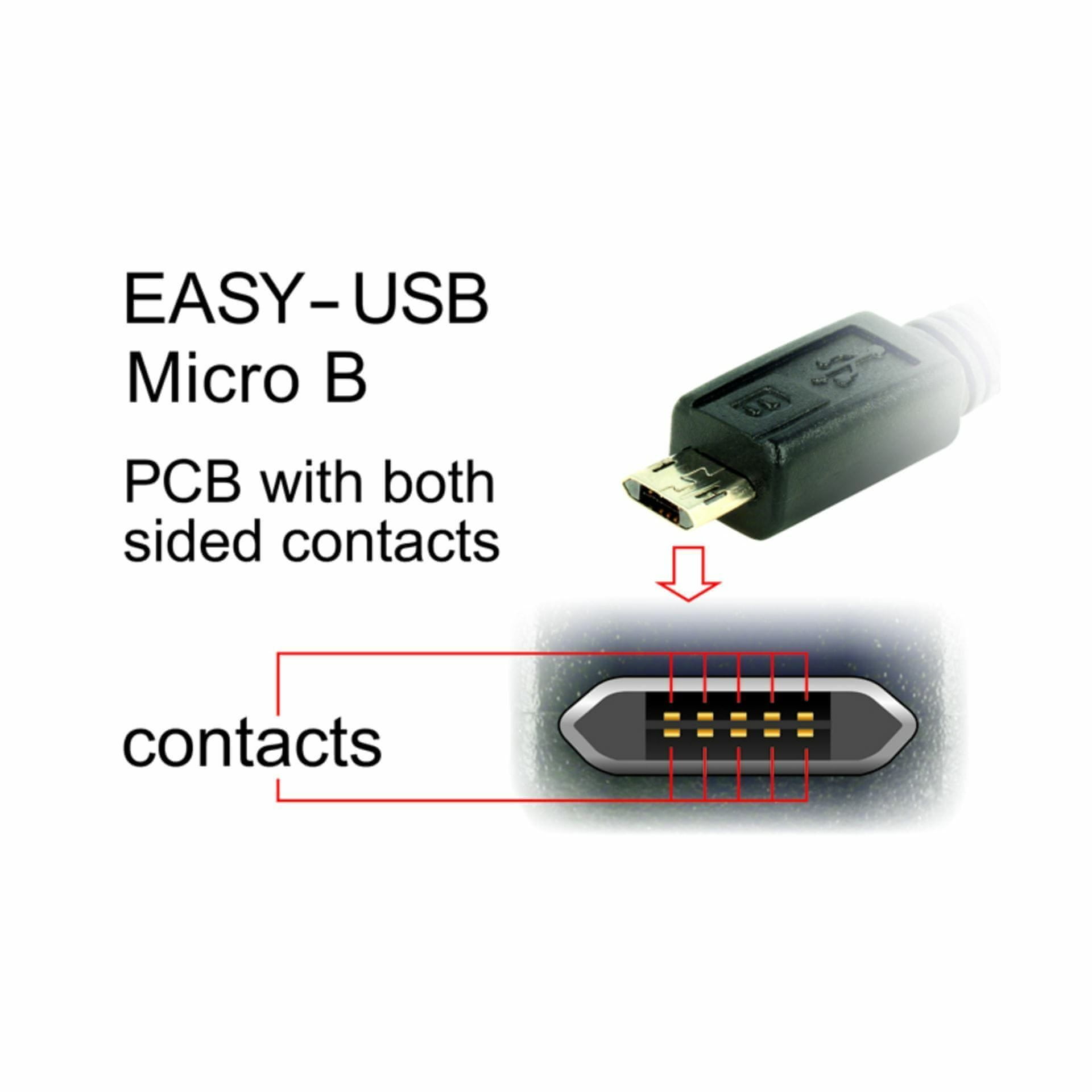 Ovaj Delock kabel s muškim EASY-USB Tipa-A i muškim EASY-USB Tipa Micro-B se može ukopčati u prikladni ženski USB priključak u oba smjera. Na taj način se muški konektor može koristiti s obje strane što olakšava ukopčavanje.