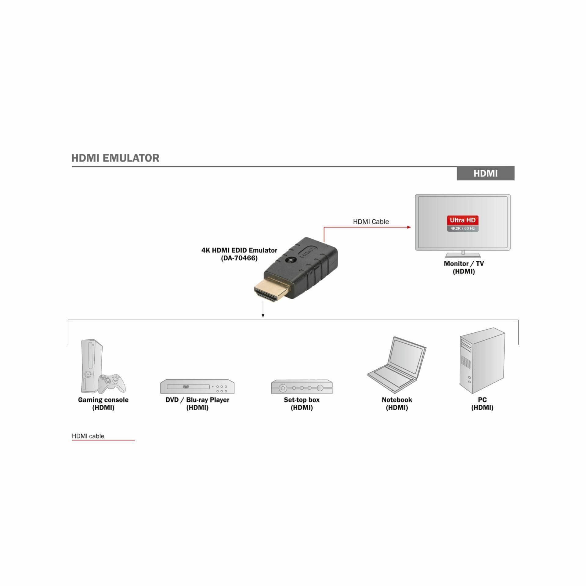 Digitus 4K HDMI adapter za emulaciju EDID podataka priključenog HDMI monitora, ekrana, televizora i rješavanje mogućih problema pri prijenosu slike.